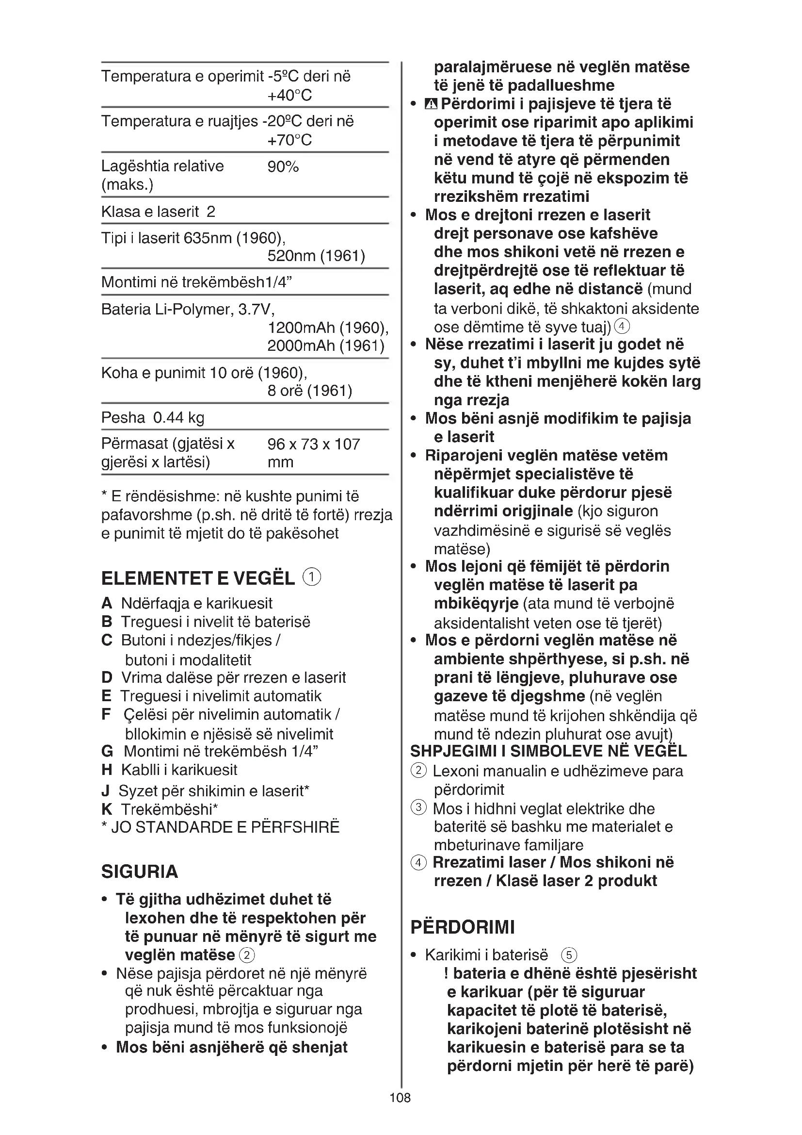 ! bateria e dhënë është pjesërisht e karikuar (për të siguruar kapacitet të plotë të baterisë, karikojeni baterinë plotësisht në karikuesin e baterisë para se ta përdorni mjetin për herë të parë) Temperatura e operimit -5ºC deri në +40°C Temperatura e ruajtjes -20ºC deri në +70°C Lagështia relative (maks.) 90% Klasa e laserit 2 Tipi i laserit 635nm (1960), 520nm (1961) Montimi në trekëmbësh1/4” Bateria Li-Polymer, 3.7V, 1200mAh (1960), 2000mAh (1961) Koha e punimit 10 orë (1960), 8 orë (1961) Pesha 0.44 kg Përmasat (gjatësi x gjerësi x lartësi) 96 x 73 x 107