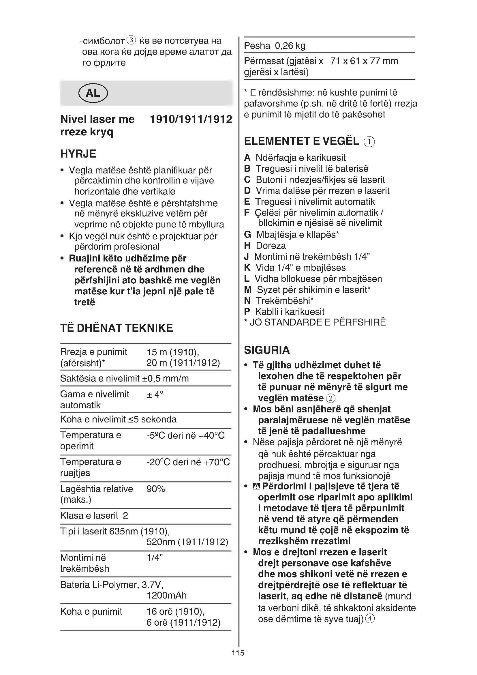 Rrezja e punimit (afërsisht)* 15 m (1910), 20 m (1911/1912) Saktësia e nivelimit ±0,5 mm/m Gama e nivelimit automatik ± 4° Koha e nivelimit ≤5 sekonda Temperatura e operimit -5ºC deri në +40°C Temperatura e ruajtjes -20ºC deri në +70°C Lagështia relative (maks.) 90% Klasa e laserit 2 Tipi i laserit 635nm (1910), 520nm (1911/1912) Montimi në trekëmbësh 1/4” Bateria Li-Polymer, 3.7V, 1200mAh Koha e punimit 16 orë (1910), 6 orë (1911/1912)116 baterisë bën të mundur që mjeti të punojë për 30 minuta ose më pak - treguesi B pulson në ngjyrë TË VERDHË që tregon se bateria po karikohet dhe kapaciteti aktual i baterisë bën të mundur që mjeti të punojë për më shumë se 30 minuta - treguesi B pulson ngjyrë JESHILE që tregon se bateria është karikuar me më shumë se 90% të kapacitetit total - treguesi B qëndron ngjyrë JESHILE kur bateria është e karikuar plotësisht