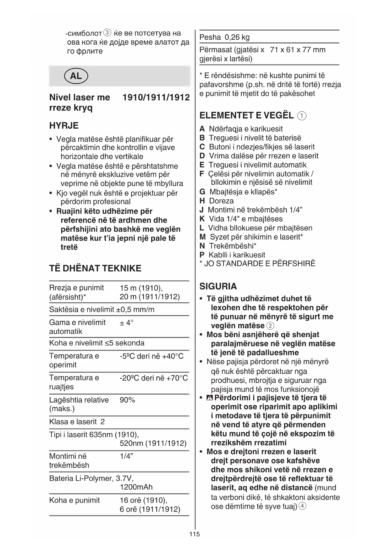 Rrezja e punimit (afërsisht)* 15 m (1910), 20 m (1911/1912) Saktësia e nivelimit ±0,5 mm/m Gama e nivelimit automatik ± 4° Koha e nivelimit ≤5 sekonda Temperatura e operimit -5ºC deri në +40°C Temperatura e ruajtjes -20ºC deri në +70°C Lagështia relative (maks.) 90% Klasa e laserit 2 Tipi i laserit 635nm (1910), 520nm (1911/1912) Montimi në trekëmbësh 1/4” Bateria Li-Polymer, 3.7V, 1200mAh Koha e punimit 16 orë (1910), 6 orë (1911/1912)116 baterisë bën të mundur që mjeti të punojë për 30 minuta ose më pak - treguesi B pulson në ngjyrë TË VERDHË që tregon se bateria po karikohet dhe kapaciteti aktual i baterisë bën të mundur që mjeti të punojë për më shumë se 30 minuta - treguesi B pulson ngjyrë JESHILE që tregon se bateria është karikuar me më shumë se 90% të kapacitetit total - treguesi B qëndron ngjyrë JESHILE kur bateria është e karikuar plotësisht