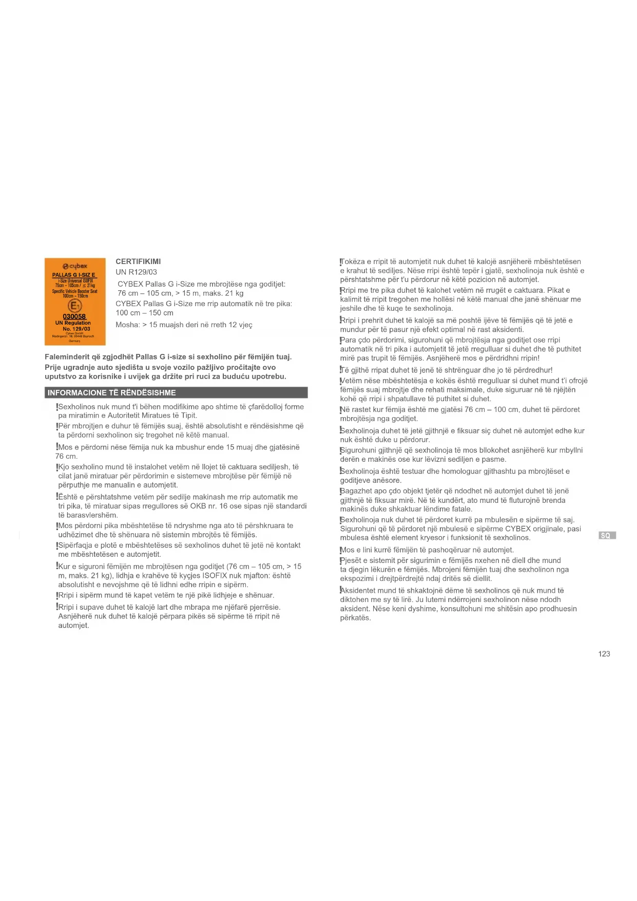 UN Regulation No. 129/03 Cybex GmbH Riedingerstr. 18, 95448 Bayreuth Germany Hvala vam što ste se odlučili za Pallas G i-Size prilikom izbora auto sjedišta za vaše djete. Lexoni me kujdes këtë manual përdorimi para se ta instaloni sexholinon në automjet dhe mbajeni gjithnjë në një vend praktik për t’iu referuar në të ardhmen.