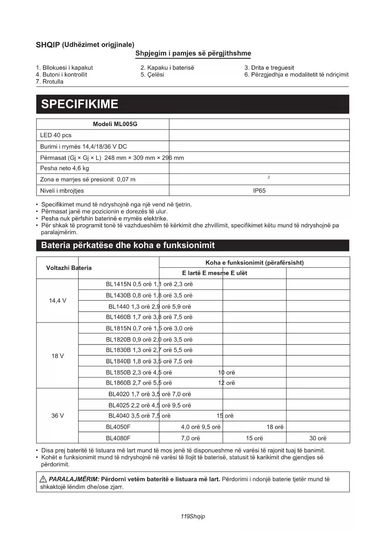 - Për shkak të programit tonë të vazhdueshëm të kërkimit dhe zhvillimit, specifikimet këtu mund të ndryshojnë pa paralajmërim. Bateria përkatëse dhe koha e funksionimit Voltazhi Bateria Koha e funksionimit (përafërsisht) E lartë E mesme E ulët 14,4 V BL1415N 0,5 orë 1,1 orë 2,3 orë BL1430B 0,8 orë 1,8 orë 3,5 orë BL1440 1,3 orë 2,9 orë 5,9 orë BL1460B 1,7 orë 3,8 orë 7,5 orë 18 V BL1815N 0,7 orë 1,5 orë 3,0 orë BL1820B 0,9 orë 2,0 orë 3,5 orë BL1830B 1,3 orë 2,7 orë 5,5 orë BL1840B 1,8 orë 3,5 orë 7,5 orë BL1850B 2,3 orë 4,5 orë 10 orë BL1860B 2,7 orë 5,5 orë 12 orë 36 V BL4020 1,7 orë 3,5 orë 7,0 orë BL4025 2,2 orë 4,5 orë 9,5 orë BL4040 3,5 orë 7,5 orë 15 orë BL4050F 4,0 orë 9,5 orë 18 orë BL4080F 7,0 orë 15 orë 30 orë