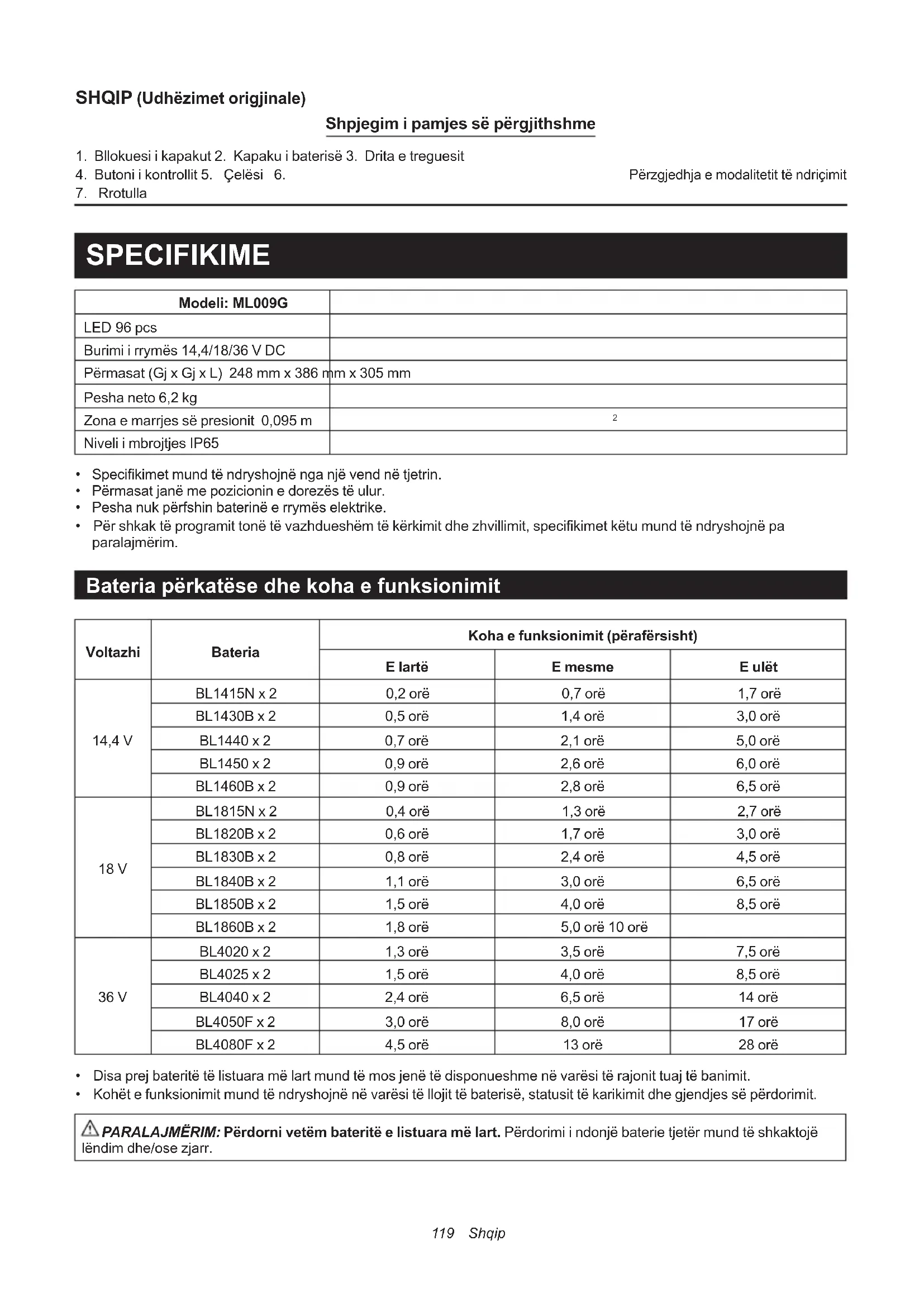 - Për shkak të programit tonë të vazhdueshëm të kërkimit dhe zhvillimit, specifikimet këtu mund të ndryshojnë pa paralajmërim. Bateria përkatëse dhe koha e funksionimit Voltazhi Bateria Koha e funksionimit (përafërsisht) E lartë E mesme E ulët 14,4 V BL1415N x 2 0,2 orë 0,7 orë 1,7 orë BL1430B x 2 0,5 orë 1,4 orë 3,0 orë BL1440 x 2 0,7 orë 2,1 orë 5,0 orë BL1450 x 2 0,9 orë 2,6 orë 6,0 orë BL1460B x 2 0,9 orë 2,8 orë 6,5 orë 18 V BL1815N x 2 0,4 orë 1,3 orë 2,7 orë BL1820B x 2 0,6 orë 1,7 orë 3,0 orë BL1830B x 2 0,8 orë 2,4 orë 4,5 orë BL1840B x 2 1,1 orë 3,0 orë 6,5 orë BL1850B x 2 1,5 orë 4,0 orë 8,5 orë BL1860B x 2 1,8 orë 5,0 orë 10 orë 36 V BL4020 x 2 1,3 orë 3,5 orë 7,5 orë BL4025 x 2 1,5 orë 4,0 orë 8,5 orë BL4040 x 2 2,4 orë 6,5 orë 14 orë BL4050F x 2 3,0 orë 8,0 orë 17 orë BL4080F x 2 4,5 orë 13 orë 28 orë