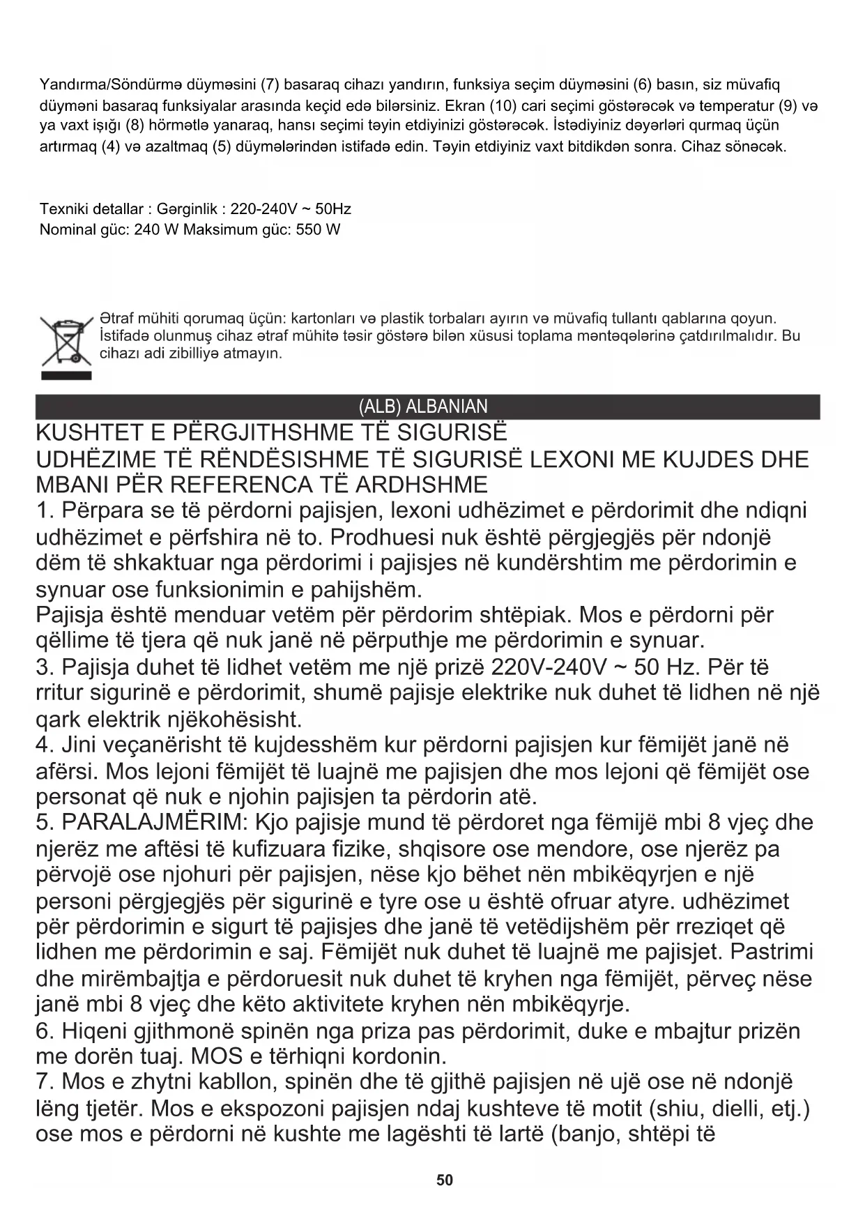njerëz me aftësi të kufizuara fizike, shqisore ose mendore, ose njerëz pa përvojë ose njohuri për pajisjen, nëse kjo bëhet nën mbikëqyrjen e një personi përgjegjës për sigurinë e tyre ose u është ofruar atyre. udhëzimet për përdorimin e sigurt të pajisjes dhe janë të vetëdijshëm për rreziqet që lidhen me përdorimin e saj. Fëmijët nuk duhet të luajnë me pajisjet. Pastrimi dhe mirëmbajtja e përdoruesit nuk duhet të kryhen nga fëmijët, përveç nëse janë mbi 8 vjeç dhe këto aktivitete kryhen nën mbikëqyrje.