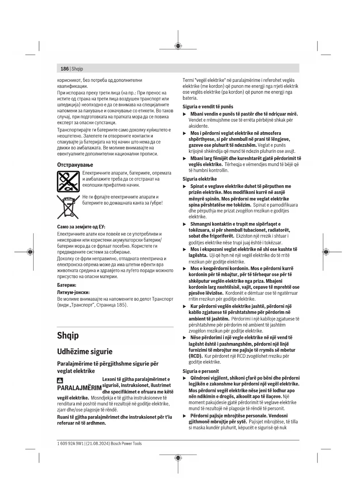 Литиум-јонски: Ве молиме внимавајте на напомените во делот Транспорт (види „Транспорт“, Страница185). Shqip Udhëzime sigurie Paralajmërime të përgjithshme sigurie për veglat elektrike PARALAJMËRIM Lexoni të gjitha paralajmërimet e sigurisë, instruksionet, ilustrimet dhe specifikimet e ofruara me këtë vegël elektrike. Mosndjekja e të gjitha instruksioneve të renditura më poshtë mund të rezultojë në goditje elektrike, zjarr dhe/ose plagosje të rëndë. Ruani të gjitha paralajmërimet dhe instruksionet për t'iu referuar në të ardhmen. Termi "vegël elektrike" në paralajmërime i referohet veglës elektrike (me kordon) që punon me energji nga rrjeti elektrik ose veglës elektrike (pa kordon) që punon me energji nga bateria. Siguria e vendit të punës u Mbani vendin e punës të pastër dhe të ndriçuar mirë. Vendet e rrëmujshme ose të errëta përbëjnë shkak për aksidente. u Mos i përdorni veglat elektrike në atmosfera shpërthyese, si për shembull në prani të lëngjeve, gazeve ose pluhurit të ndezshëm. Veglat e punës krijojnë shkëndija që mund të ndezin pluhurin ose avujt. u Mbani larg fëmijët dhe kureshtarët gjatë përdorimit të veglës elektrike. Tërheqja e vëmendjes mund të bëjë që të humbni kontrollin. Siguria elektrike u Spinat e veglave elektrike duhet të përputhen me prizën elektrike. Mos modifikoni kurrë në asnjë mënyrë spinën. Mos përdorni me veglat elektrike spina përshtatëse me tokëzim. Spinat e pamodifikuara dhe përputhja me prizat zvogëlon rrezikun e goditjes elektrike. u Shmangni kontaktin e trupit me sipërfaqet e tokëzuara, si për shembull tubacionet, radiatorët, sobat dhe frigoriferët. Ekziston një rrezik i shtuar i goditjes elektrike nëse trupi juaj është i tokëzuar. u Mos i ekspozoni veglat elektrike në shi ose kushte të lagështa. Uji që hyn në një vegël elektrike do të rritë rrezikun për goditje elektrike. u Mos e keqpërdorni kordonin. Mos e përdorni kurrë kordonin për të mbajtur, për të tërhequr ose për të shkëputur veglën elektrike nga priza. Mbajeni kordonin larg nxehtësisë, vajit, cepave të mprehtë ose pjesëve lëvizëse. Kordonët e dëmtuar ose të ngatërruar rritin rrezikun për goditje elektrike. u Kur përdorni veglën elektrike jashtë, përdorni një kabllo zgjatuese të përshtatshme për përdorim në ambient të jashtëm. Përdorimi i një kablloje zgjatuese të përshtatshme për përdorim në ambient të jashtëm zvogëlon rrezikun për goditje elektrike. u Nëse përdorimi i një vegle elektrike në një vend të lagësht është i pashmangshëm, përdorni një linjë furnizimi të mbrojtur me pajisje të rrymës së mbetur (RCD). Kur përdoret një RCD zvogëlohet rreziku për goditje elektrike. Siguria e personit u Qëndroni vigjilent, shikoni çfarë po bëni dhe përdorni logjikën e zakonshme kur përdorni një vegël elektrike. Mos përdorni vegël elektrike nëse jeni të lodhur apo nën ndikimin e drogës, alkoolit apo të ilaçeve. Një moment pakujdesie gjatë përdorimit të veglave elektrike mund të rezultojë në plagosje të rëndë të personit. u Përdorni pajisje mbrojtëse personale. Vendosni gjithmonë mbrojtje për sytë. Pajisjet mbrojtëse, të tilla si maska kundër pluhurit, këpucët e sigurisë që nuk 1 609 92A 9W1 | (21.08.2024) Bosch Power ToolsShqip | 187 rrëshqasin, helmeta e punës ose mbrojtja e dëgjimit sipas rrethanave të përshtatshme, zvogëlon mundësinë për plagosje të personit. u Parandaloni ndezjen aksidentale. Sigurohuni që çelësi është në pozicionin fikur përpara se ta lidhni pajisjen me burimin e energjisë dhe/ose baterinë, përpara se ta kapni apo të transportoni veglën. Mbajtja e veglave elektrike me gishtin te çelësi ose ushqimi me energji i veglave elektrike përbën shkak për aksidente. u Hiqni çdo çelës rregullues ose shtrëngues përpara se të ndizni veglën elektrike. Çelësi shtrëngues ose rregullues i mbetur në një pjesë rrotulluese të veglës elektrike mund të rezultojë në plagosje të personit. u Mos u zgjatni shumë. Ruani mbështetjen e duhur me këmbë dhe ekuilibrin në çdo kohë. Kjo mundëson kontroll më të mirë të veglës elektrike në rrethana të papritura. u Vishuni si duhet. Mos vishni veshje të gjera ose mos mbani bizhuteri. Mbani flokët dhe veshjet larg nga pjesët rrotulluese. Veshjet e lira, bizhuteritë ose flokët e gjatë mund të kapen në pjesët rrotulluese. u Nëse pajisje janë parashikuar me lidhje për thithjen e pluhurit dhe të objekteve mbledhëse, sigurohuni që këto janë të lidhura dhe përdoren si duhet. Përdorimi i mbledhjes së pluhurit mund të zvogëlojë rreziqet që lidhen me pluhurin. u Mos lejoni që familjariteti i krijuar nga përdorimi i shpeshtë i veglave elektrike t'ju bëjë mospërfillës dhe të neglizhoni parimet e sigurisë së veglave elektrike. Një veprim i pakujdesshëm mund të shkaktojë plagosje të rëndë në fraksionin e një sekonde. Përdorimi dhe kujdesi për veglat elektrike u Mos ushtroni forcë mbi veglën elektrike. Përdorni veglën e duhur elektrike për qëllimin tuaj. Vegla e duhur elektrike do ta kryejë punën më mirë dhe më saktë në shpejtësinë me të cilën është projektuar. u Mos e përdorni veglën elektrike nëse çelësi nuk ndizet dhe nuk fiket. Çdo vegël elektrike që nuk mund të komandohet është e rrezikshme dhe duhet riparuar. u Shkëputni spinën nga burimi i energjisë dhe/ose hiqni baterinë nga vegla elektrike, nëse çmontohet, përpara se të kryeni ndonjë rregullim, të ndërroni aksesorët ose përpara se t'i vendosni veglat elektrike në ruajtje. Këto masa parandaluese të sigurisë zvogëlojnë rrezikun e ndezjes aksidentale të veglës elektrike. u Ruani veglat elektrike që nuk i përdorni larg fëmijëve dhe mos lejoni përdorimin e veglës elektrike nga 