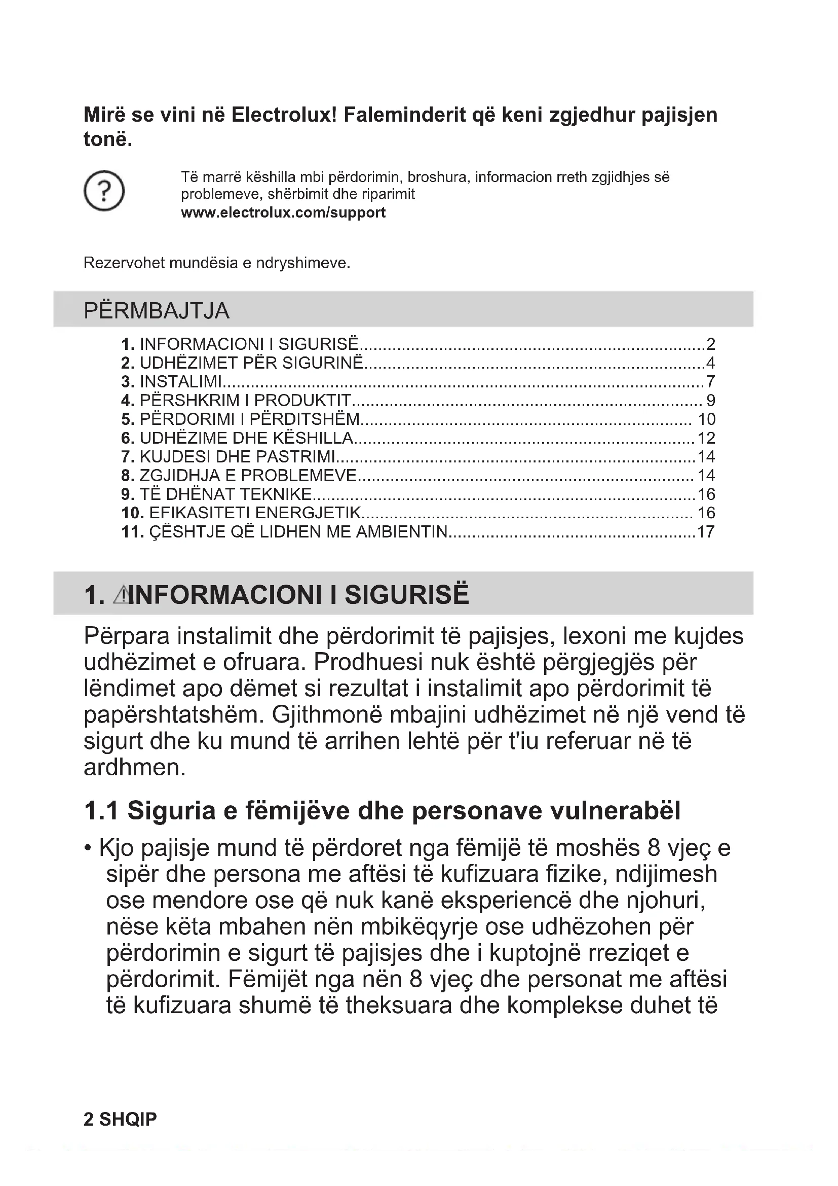 - Kjo pajisje mund të përdoret nga fëmijë të moshës 8 vjeç e sipër dhe persona me aftësi të kufizuara fizike, ndijimesh ose mendore ose që nuk kanë eksperiencë dhe njohuri, nëse këta mbahen nën mbikëqyrje ose udhëzohen për përdorimin e sigurt të pajisjes dhe i kuptojnë rreziqet e përdorimit. Fëmijët nga nën 8 vjeç dhe personat me aftësi të kufizuara shumë të theksuara dhe komplekse duhet të 2 SHQIPmbahen larg nga pajisja, përveçse kur mbahen nën monitorim të vazhdueshëm.