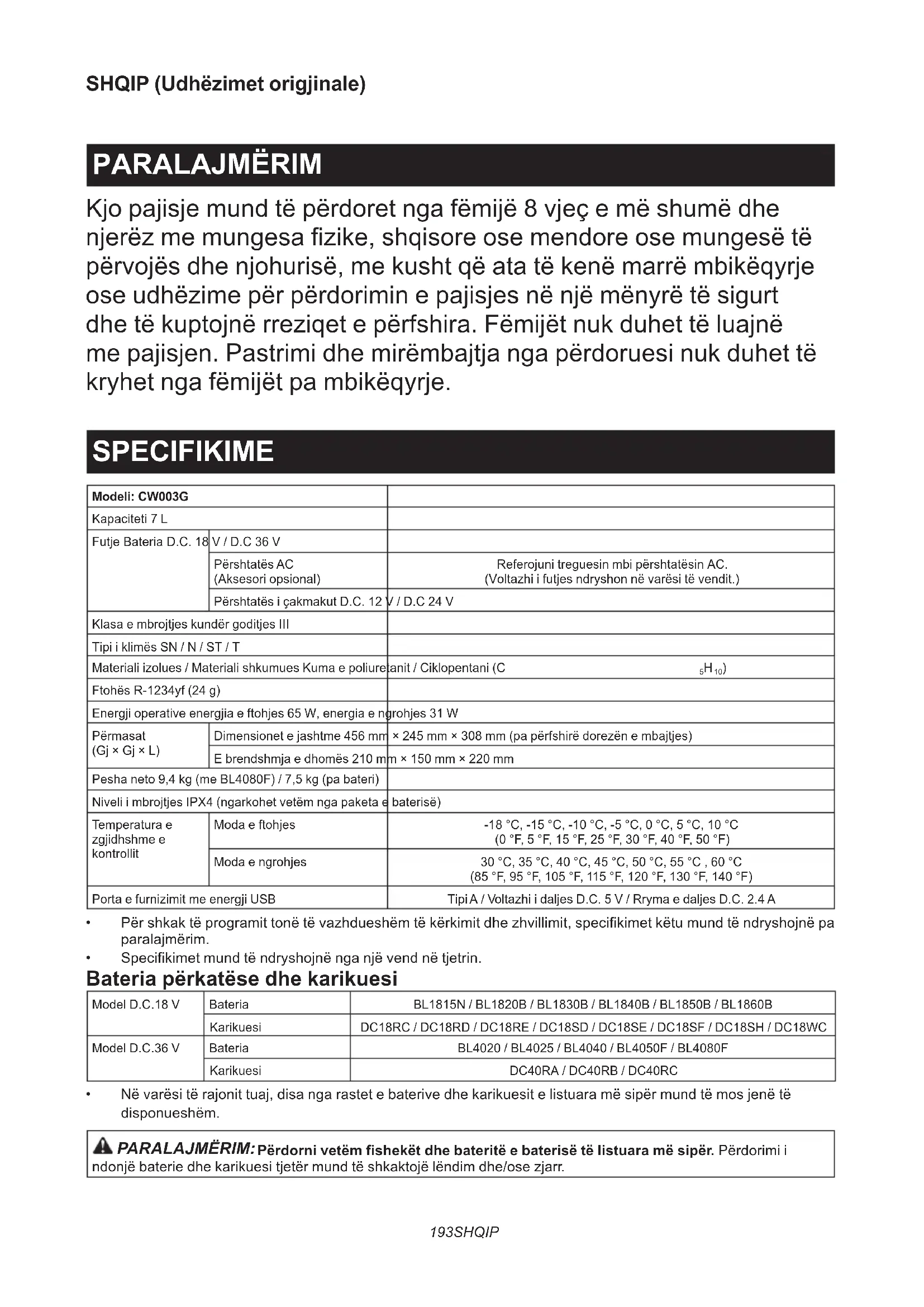 - Originalna baterija in polnilnik Makita OPOMBA: Nekatere postavke na seznamu so lahko vključene v paket opreme orodja kot standardna dodatna oprema. Lahko se razlikujejo od države do države.193 SHQIP SHQIP (Udhëzimet origjinale) PARALAJMËRIM Kjo pajisje mund të përdoret nga fëmijë 8 vjeç e më shumë dhe njerëz me mungesa fizike, shqisore ose mendore ose mungesë të përvojës dhe njohurisë, me kusht që ata të kenë marrë mbikëqyrje ose udhëzime për përdorimin e pajisjes në një mënyrë të sigurt dhe të kuptojnë rreziqet e përfshira. Fëmijët nuk duhet të luajnë me pajisjen. Pastrimi dhe mirëmbajtja nga përdoruesi nuk duhet të kryhet nga fëmijët pa mbikëqyrje. SPECIFIKIME Modeli: CW003GKapaciteti 7 LFutje Bateria D.C. 18 V / D.C 36 VPërshtatës AC (Aksesori opsional)Referojuni treguesin mbi përshtatësin AC. (Voltazhi i futjes ndryshon në varësi të vendit.)Përshtatës i çakmakut D.C. 12 V / D.C 24 VKlasa e mbrojtjes kundër goditjes IIITipi i klimës SN / N / ST / TMateriali izolues / Materiali shkumues Kuma e poliuretanit / Ciklopentani (C