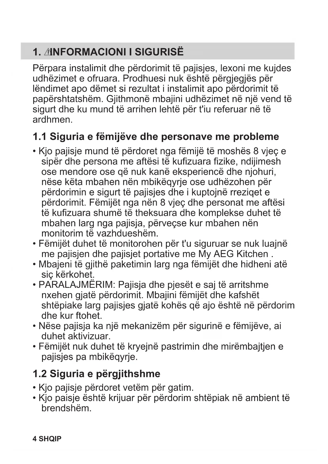 - Kjo pajisje mund të përdoret nga fëmijë të moshës 8 vjeç e sipër dhe persona me aftësi të kufizuara fizike, ndijimesh ose mendore ose që nuk kanë eksperiencë dhe njohuri, nëse këta mbahen nën mbikëqyrje ose udhëzohen për përdorimin e sigurt të pajisjes dhe i kuptojnë rreziqet e përdorimit. Fëmijët nga nën 8 vjeç dhe personat me aftësi të kufizuara shumë të theksuara dhe komplekse duhet të mbahen larg nga pajisja, përveçse kur mbahen nën monitorim të vazhdueshëm.