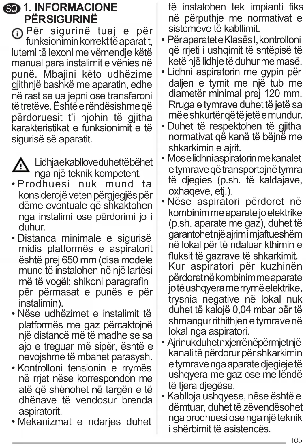 - Lidhur me masat teknike e të sigurisë për t'u adoptuar për shkarkimin e tymrave ka rëndësi që t'u përmbaheni rreptësisht rregulloreve të përcaktuara nga autoritet vendore. NJOFTIM: Para se ta instaloni aspiratorin, hiqini cipën mbrojtëse plastike.