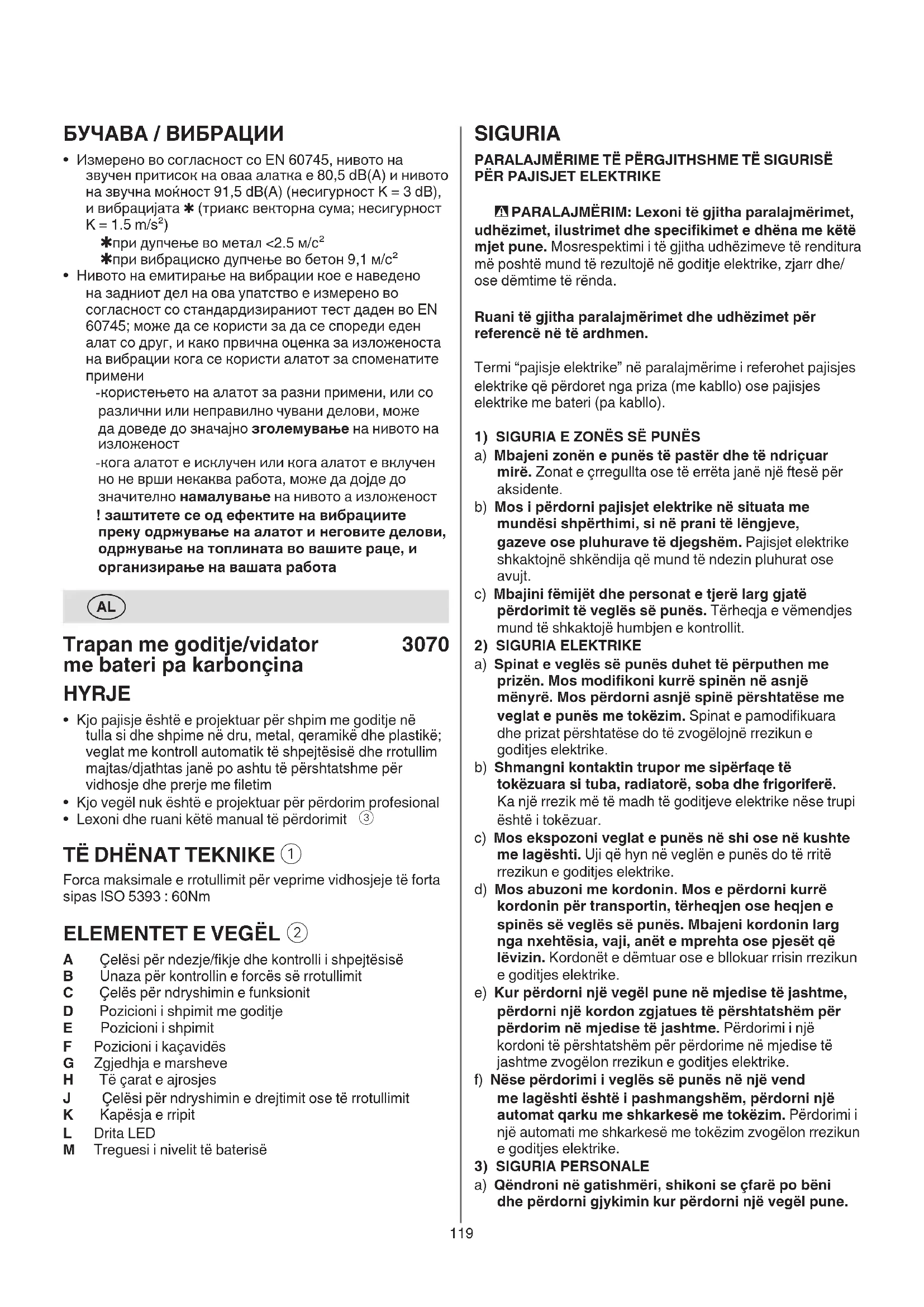 A Çelësi për ndezje/kje dhe kontrolli i shpejtësisë B Unaza për kontrollin e forcës së rrotullimit C Çelës për ndryshimin e funksionit D Pozicioni i shpimit me goditje E Pozicioni i shpimit F Pozicioni i kaçavidës G Zgjedhja e marsheve H Të çarat e ajrosjes J Çelësi për ndryshimin e drejtimit ose të rrotullimit K Kapësja e rripit L Drita LED M Treguesi i nivelit të baterisë120 Nëse dëmtohet, riparojeni veglën e punës para përdorimit. Shumë aksidente shkaktohen nga veglat e punës jo të mirëmbajtura si duhet. f) Mbajini pajisjet prerëse të pastra dhe të mprehta. Pajisjet e prerjes të mirëmbajtura dhe me anë të mprehta kanë më pak mundësi për t’u bllokuar dhe janë më të lehta për t’u kontrolluar. g) Përdorni veglat e punës, aksesorët dhe puntot, etj. në përputhje me këto udhëzime, duke marrë parasysh kushtet e punës dhe punën që do të kryhet. Përdorimi i veglave për përdorime të ndryshme nga ato të përcaktuara mund të shkaktojë rreziqe. h) Mbajini dorezat dhe sipërfaqet ku mbaheni të thata, të pastra dhe pa vajra ose graso. Dorezat dhe sipërfaqet ku mbaheni, kur janë të rrëshqitshme, nuk ju lejojnë ta menaxhoni dhe ta kontrolloni në mënyrë të sigurt pajisjen në situata të papritura.