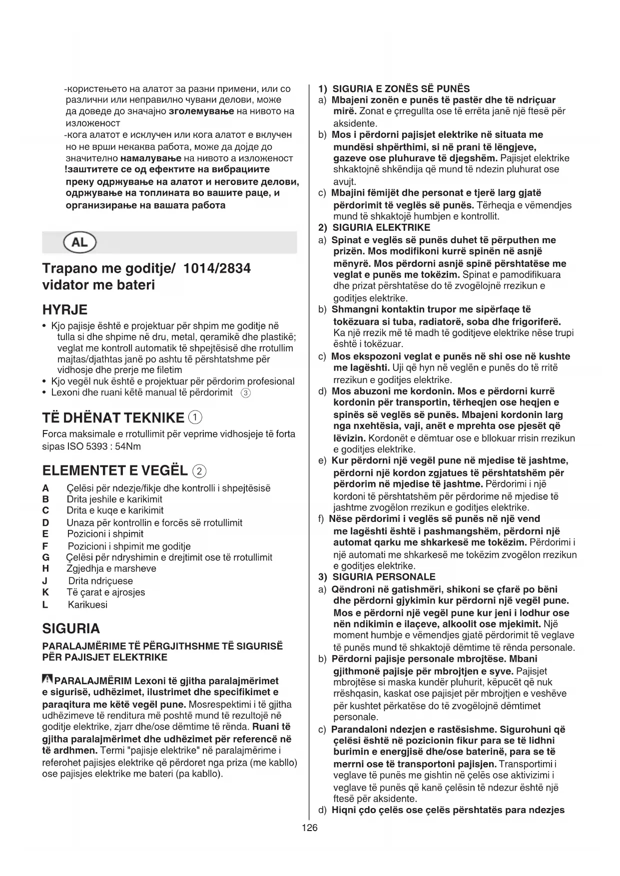 PARALAJMËRIM Lexoni të gjitha paralajmërimet e sigurisë, udhëzimet, ilustrimet dhe specikimet e paraqitura me këtë vegël pune. Mosrespektimi i të gjitha udhëzimeve të renditura më poshtë mund të rezultojë në goditje elektrike, zjarr dhe/ose dëmtime të rënda. Ruani të gjitha paralajmërimet dhe udhëzimet për referencë në të ardhmen. Termi "pajisje elektrike" në paralajmërime i referohet pajisjes elektrike që përdoret nga priza (me kabllo) ose pajisjes elektrike me bateri (pa kabllo).127
