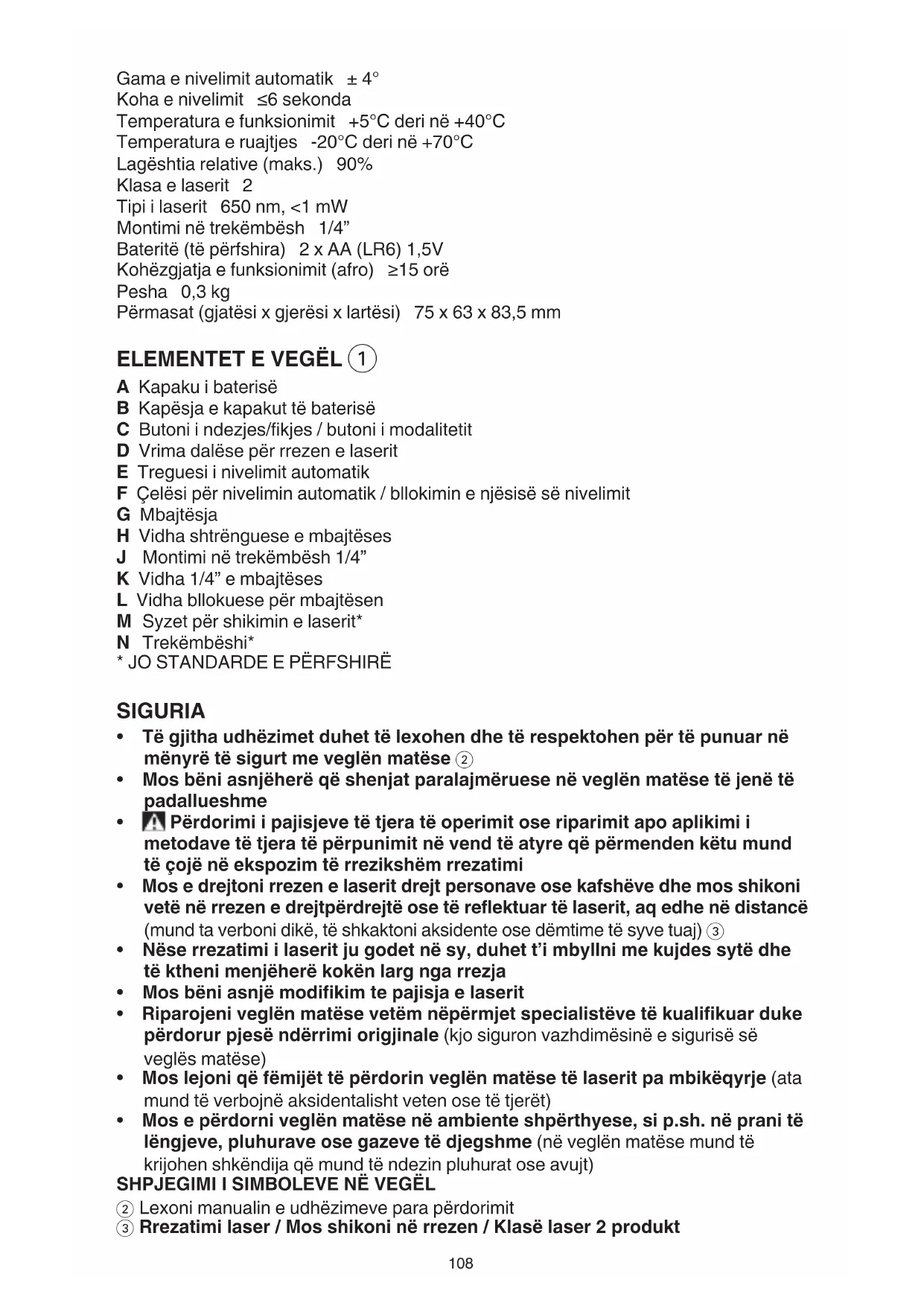 2 Lexoni manualin e udhëzimeve para përdorimit 3 Rrezatimi laser / Mos shikoni në rrezen / Klasë laser 2 produkt109 4 Mos i hidhni veglat elektrike dhe bateritë së bashku me materialet e mbeturinave familjare PËRDORIMI