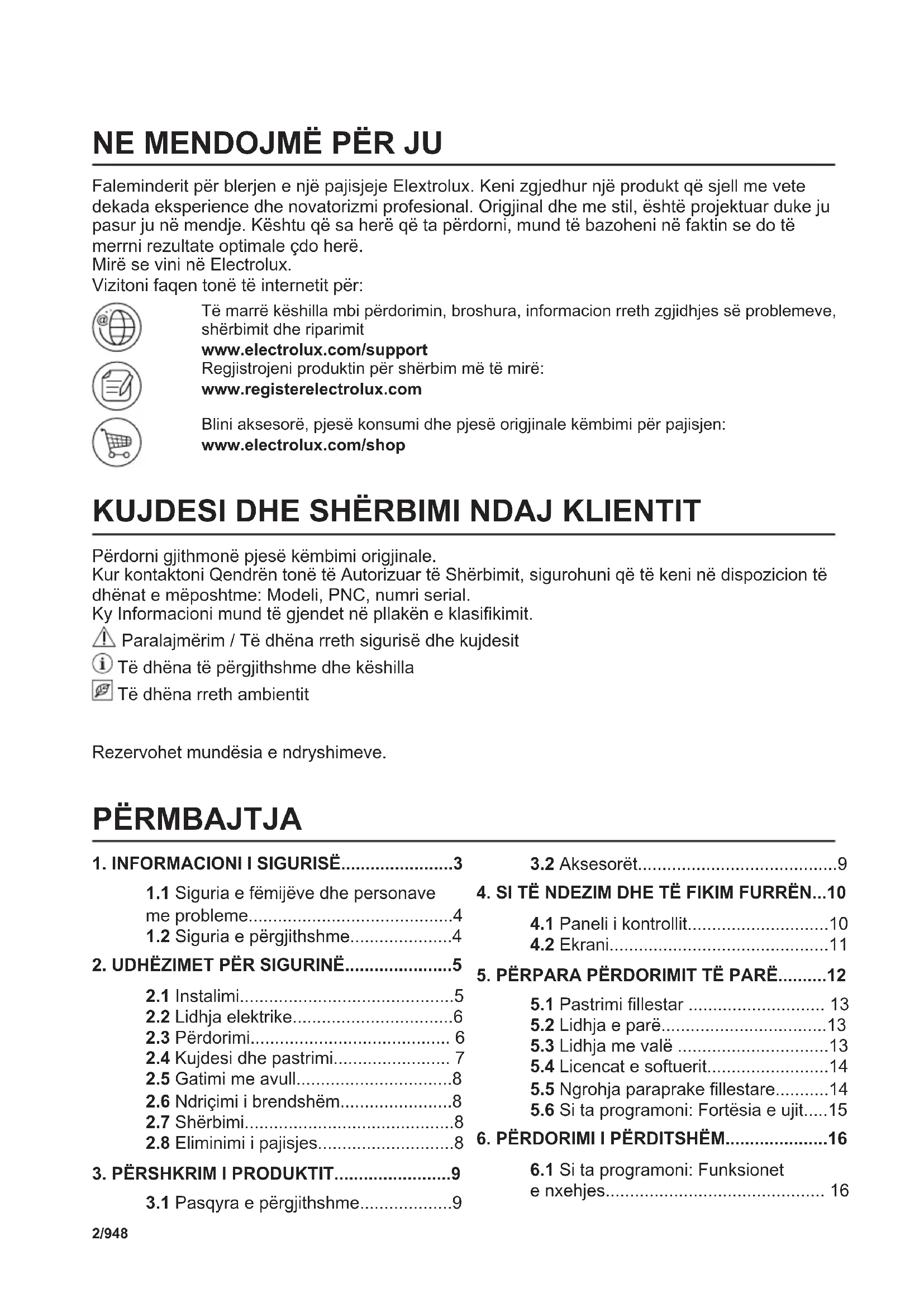 Faleminderit për blerjen e një pajisjeje Elextrolux. Keni zgjedhur një produkt që sjell me vete dekada eksperience dhe novatorizmi profesional. Origjinal dhe me stil, është projektuar duke ju pasur ju në mendje. Kështu që sa herë që ta përdorni, mund të bazoheni në faktin se do të merrni rezultate optimale çdo herë. Mirë se vini në Electrolux. Vizitoni faqen tonë të internetit për: Të marrë këshilla mbi përdorimin, broshura, informacion rreth zgjidhjes së problemeve, shërbimit dhe riparimit www.electrolux.com/support Regjistrojeni produktin për shërbim më të mirë: www.registerelectrolux.com Blini aksesorë, pjesë konsumi dhe pjesë origjinale këmbimi për pajisjen: www.electrolux.com/shop