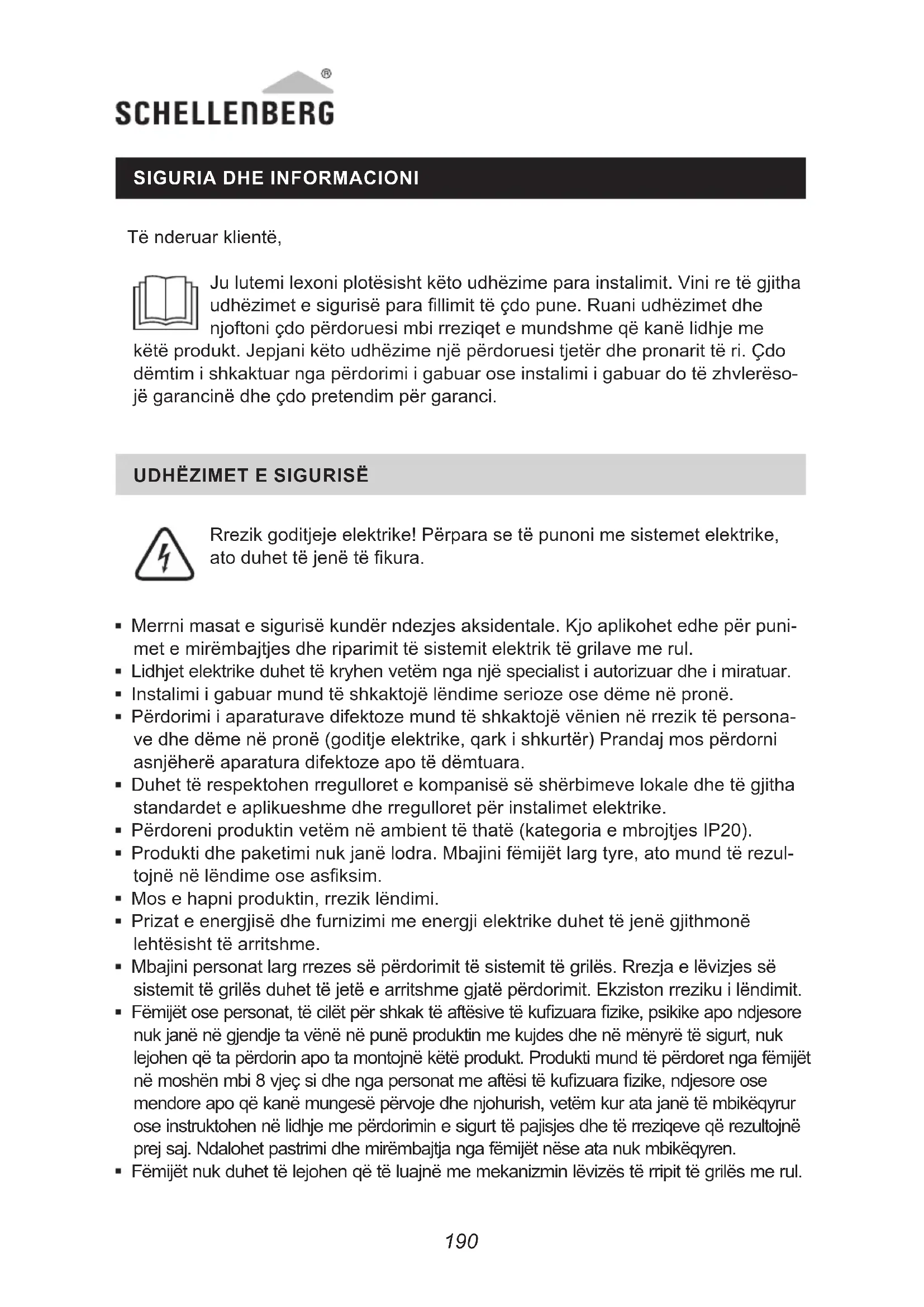 Rrezik goditjeje elektrike! Përpara se të punoni me sistemet elektrike, ato duhet të jenë të kura. Merrni masat e sigurisë kundër ndezjes aksidentale. Kjo aplikohet edhe për puni- met e mirëmbajtjes dhe riparimit të sistemit elektrik të grilave me rul. Lidhjet elektrike duhet të kryhen vetëm nga një specialist i autorizuar dhe i miratuar. Instalimi i gabuar mund të shkaktojë lëndime serioze ose dëme në pronë. Përdorimi i aparaturave difektoze mund të shkaktojë vënien në rrezik të persona- ve dhe dëme në pronë (goditje elektrike, qark i shkurtër) Prandaj mos përdorni asnjëherë aparatura difektoze apo të dëmtuara. Duhet të respektohen rregulloret e kompanisë së shërbimeve lokale dhe të gjitha standardet e aplikueshme dhe rregulloret për instalimet elektrike. Përdoreni produktin vetëm në ambient të thatë (kategoria e mbrojtjes IP20). Produkti dhe paketimi nuk janë lodra. Mbajini fëmijët larg tyre, ato mund të rezul- tojnë në lëndime ose asksim. Mos e hapni produktin, rrezik lëndimi. Prizat e energjisë dhe furnizimi me energji elektrike duhet të jenë gjithmonë lehtësisht të arritshme. Mbajini personat larg rrezes së përdorimit të sistemit të grilës. Rrezja e lëvizjes së sistemit të grilës duhet të jetë e arritshme gjatë përdorimit. Ekziston rreziku i lëndimit. Fëmijët ose personat, të cilët për shkak të aftësive të kuzuara zike, psikike apo ndjesore nuk janë në gjendje ta vënë në punë produktin me kujdes dhe në mënyrë të sigurt, nuk lejohen që ta përdorin apo ta montojnë këtë produkt. Produkti mund të përdoret nga fëmijët në moshën mbi 8 vjeç si dhe nga personat me aftësi të kuzuara zike, ndjesore ose mendore apo që kanë mungesë përvoje dhe njohurish, vetëm kur ata janë të mbikëqyrur ose instruktohen në lidhje me përdorimin e sigurt të pajisjes dhe të rreziqeve që rezultojnë prej saj. Ndalohet pastrimi dhe mirëmbajtja nga fëmijët nëse ata nuk mbikëqyren. Fëmijët nuk duhet të lejohen që të luajnë me mekanizmin lëvizës të rripit të grilës me rul.191190
