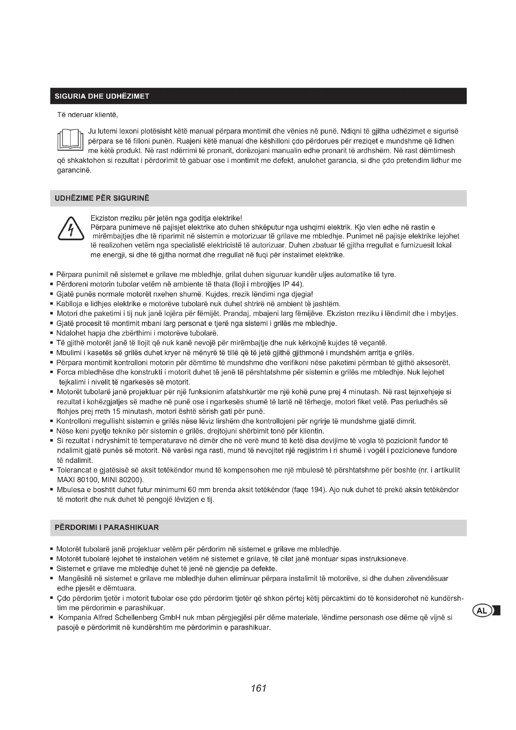 SIGURIA DHE UDHëZImET Të nderuar klientë, Ju lutemi lexoni plotësisht këtë manual përpara montimit dhe vënies në punë. Ndiqni të gjitha udhëzimet e sigurisë përpara se të lloni punën. Ruajeni këtë manual dhe këshilloni çdo përdorues për rreziqet e mundshme që lidhen me këtë produkt. Në rast ndërrimi të pronarit, dorëzojani manualin edhe pronarit të ardhshëm. Në rast dëmtimesh që shkaktohen si rezultat i përdorimit të gabuar ose i montimit me defekt, anulohet garancia, si dhe çdo pretendim lidhur me garancinë. UDHëZImE PëR SIGURINë Ekziston rreziku për jetën nga goditja elektrike! Përpara punimeve në pajisjet elektrike ato duhen shkëputur nga ushqimi elektrik. Kjo vlen edhe në rastin e mirëmbajtjes dhe të riparimit në sistemin e motorizuar të grilave me mbledhje. Punimet në pajisje elektrike lejohet të realizohen vetëm nga specialistë elektricistë të autorizuar. Duhen zbatuar të gjitha rregullat e furnizuesit lokal me energji, si dhe të gjitha normat dhe rregullat në fuqi për instalimet elektrike. Përpara punimit në sistemet e grilave me mbledhje, grilat duhen siguruar kundër uljes automatike të tyre. Përdoreni motorin tubolar vetëm në ambiente të thata (lloji i mbrojtjes IP 44). Gjatë punës normale motorët nxehen shumë. Kujdes, rrezik lëndimi nga djegia! Kablloja e lidhjes elektrike e motorëve tubolarë nuk duhet shtrirë në ambient të jashtëm. Motori dhe paketimi i tij nuk janë lojëra për fëmijët. Prandaj, mbajeni larg fëmijëve. Ekziston rreziku i lëndimit dhe i mbytjes. Gjatë procesit të montimit mbani larg personat e tjerë nga sistemi i grilës me mbledhje. Ndalohet hapja dhe zbërthimi i motorëve tubolarë. Të gjithë motorët janë të llojit që nuk kanë nevojë për mirëmbajtje dhe nuk kërkojnë kujdes të veçantë. Mbulimi i kasetës së grilës duhet kryer në mënyrë të tillë që të jetë gjithë gjithmonë i mundshëm arritja e grilës. Përpara montimit kontrolloni motorin për dëmtime të mundshme dhe verikoni nëse paketimi përmban të gjithë aksesorët. Forca mbledhëse dhe konstrukti i motorit duhet të jenë të përshtatshme për sistemin e grilës me mbledhje. Nuk lejohet tejkalimi i nivelit të ngarkesës së motorit. Motorët tubolarë janë projektuar për një funksionim afatshkurtër me një kohë pune prej 4 minutash. Në rast tejnxehjeje si rezultat i kohëzgjatjes së madhe në punë ose i ngarkesës shumë të lartë në tërheqje, motori ket vetë. Pas periudhës së ftohjes prej rreth 15 minutash, motori është sërish gati për punë. Kontrolloni rregullisht sistemin e grilës nëse lëviz lirshëm dhe kontrollojeni për ngrirje të mundshme gjatë dimrit. Nëse keni pyetje teknike për sistemin e grilës, drejtojuni shërbimit tonë për klientin. Si rezultat i ndryshimit të temperaturave në dimër dhe në verë mund të ketë disa devijime të vogla të pozicionit fundor të ndalimit gjatë punës së motorit. Në varësi nga rasti, mund të nevojitet një regjistrim i ri shumë i vogël i pozicioneve fundore të ndalimit. Tolerancat e gjatësisë së aksit tetëkëndor mund të kompensohen me një mbulesë të përshtatshme për boshte (nr. i artikullit MAXI 80100, MINI 80200). Mbulesa e boshtit duhet futur minimumi 60 mm brenda aksit tetëkëndor (faqe 194). Ajo nuk duhet të prekë aksin tetëkëndor të motorit dhe nuk duhet të pengojë lëvizjen e tij. PëRDORImI I PARASHIKUAR Motorët tubolarë janë projektuar vetëm për përdorim në sistemet e grilave me mbledhje. Motorët tubolarë lejohet të instalohen vetëm në sistemet e grilave, të cilat janë montuar sipas instruksioneve. Sistemet e grilave me mbledhje duhet të jenë në gjendje pa defekte. Mangësitë në sistemet e grilave me mbledhje duhen eliminuar përpara instalimit të motorëve, si dhe duhen zëvendësuar edhe pjesët e dëmtuara. Çdo përdorim tjetër i motorit tubolar ose çdo përdorim tjetër që shkon përtej këtij përcaktimi do të konsiderohet në kundërsh- tim me përdorimin e parashikuar. Kompania Alfred Schellenberg GmbH nuk mban përgjegjësi për dëme materiale, lëndime personash ose dëme që vijnë si pasojë e përdorimit në kundërshtim me përdorimin e parashikuar.162 DEKLArAtA DhE KonformitEti mE „cE“ Motori tubolar (Nr. i artikullit 20506/20510/20810/20820/20840/20507/20511/20811) përmbush kërkesat në fuqi të rregullave dhe direktivave evropiane dhe kombëtare. Konformiteti i tij është vërtetuar, si dhe sqarimet dhe dokumentacioni përkatës janë të depozituara pranë prodhuesit. Mos e hidhni në mbeturinat e shtëpisë! Motorët janë mallra të riciklueshëm dhe mund të dorëzohen në një qendër riciklimi ose në një vend grumbullimi të pajisjeve të vjetra elektrike të shtëpisë.