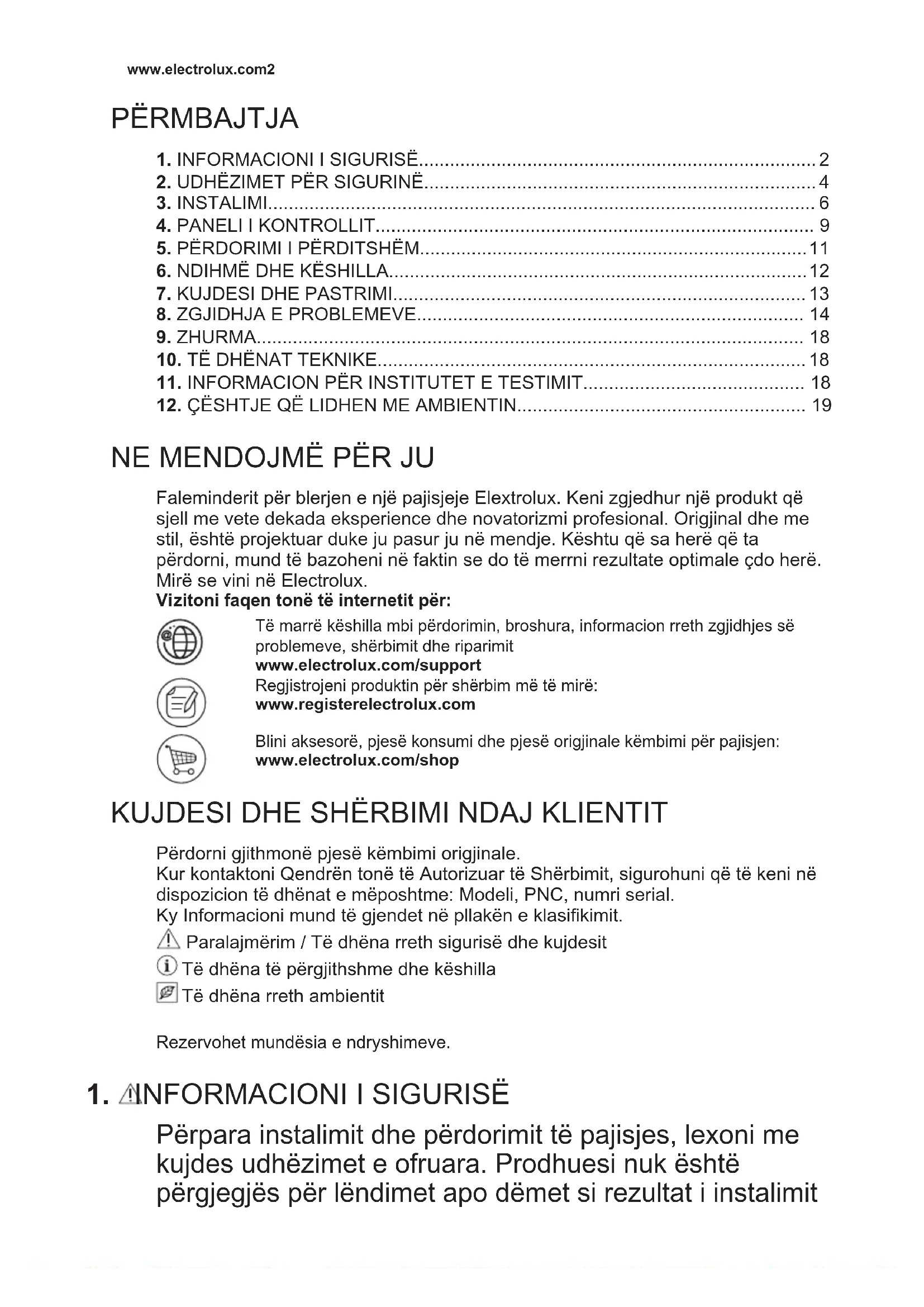 Përpara instalimit dhe përdorimit të pajisjes, lexoni me kujdes udhëzimet e ofruara. Prodhuesi nuk është përgjegjës për lëndimet apo dëmet si rezultat i instalimit www.electrolux.com2apo përdorimit të papërshtatshëm. Gjithmonë mbajini udhëzimet në një vend të sigurt dhe ku mund të arrihen lehtë për t'iu referuar në të ardhmen.
