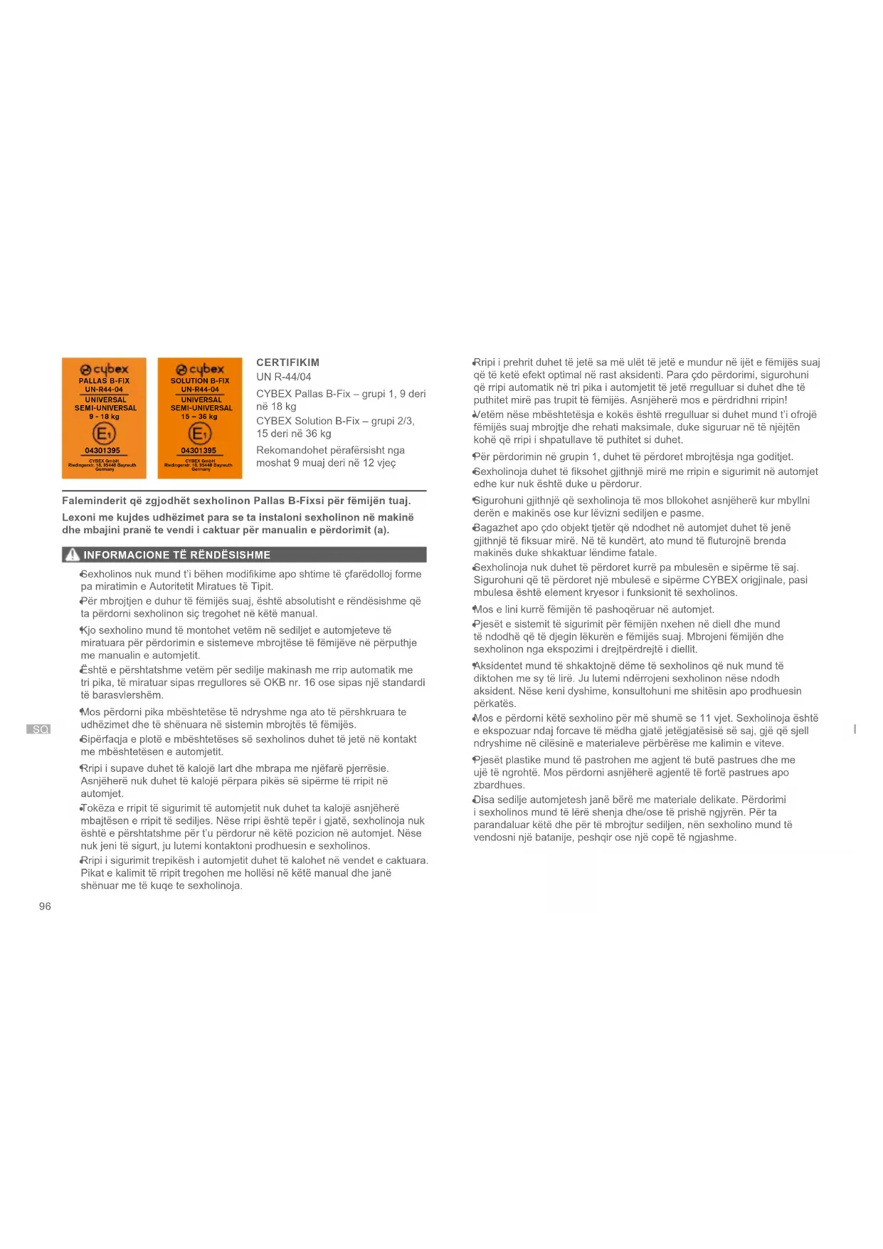 CERTIFIKIM UN R-44/04 CYBEX Pallas B-Fix – grupi 1, 9 deri në 18 kg CYBEX Solution B-Fix – grupi 2/3, 15 deri në 36 kg Rekomandohet përafërsisht nga moshat 9 muaj deri në 12 vjeç Faleminderit që zgjodhët sexholinon Pallas B-Fixsi për fëmijën tuaj. Lexoni me kujdes udhëzimet para se ta instaloni sexholinon në makinë dhe mbajini pranë te vendi i caktuar për manualin e përdorimit (a).