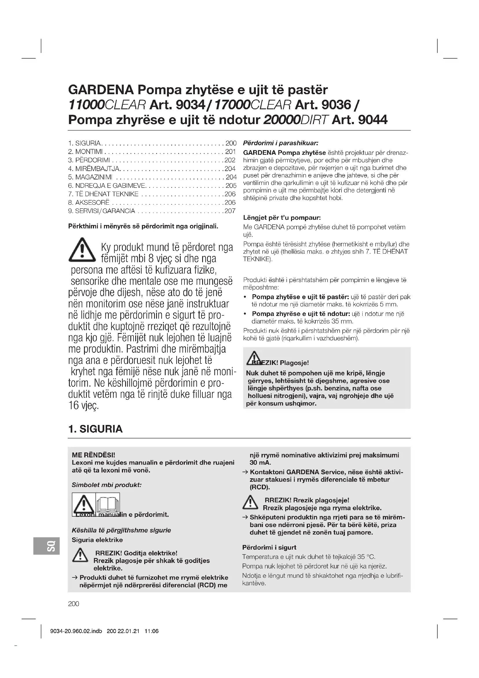 ME RËNDËSI! Lexoni me kujdes manualin e përdorimit dhe ruajeni atë që ta lexoni më vonë. Simbolet mbi produkt: Lexoni manualin e përdorimit. Këshilla të përgjithshme sigurie Siguria elektrike RREZIK! Goditja elektrike! Rrezik plagosje për shkak të goditjes elektrike. v Produkti duhet të furnizohet me rrymë elektrike nëpërmjet një ndërprerësi diferencial (RCD) me një rrymë nominative aktivizimi prej maksimumi 30 mA. v Kontaktoni GARDENA Service, nëse është aktivi- zuar stakuesi i rrymës diferenciale të mbetur (RCD). RREZIK! Rrezik plagosjeje! Rrezik plagosjeje nga rryma elektrike. v Shkëputeni produktin nga rrjeti para se të mirëm- bani ose ndërroni pjesë. Për ta bërë këtë, priza duhet të gjendet në zonën tuaj pamore. Përdorimi i sigurt Temperatura e ujit nuk duhet të tejkalojë 35 °C. Pompa nuk lejohet të përdoret kur në ujë ka njerëz. Ndotja e lëngut mund të shkaktohet nga rrjedhja e lubrifi- kantëve. GARDENA Pompa zhytëse e ujit të pastër 11000CLEAR Art. 9034 / 17000CLEAR Art. 9036 / Pompa zhyrëse e ujit të ndotur 20000DIRT Art. 9044