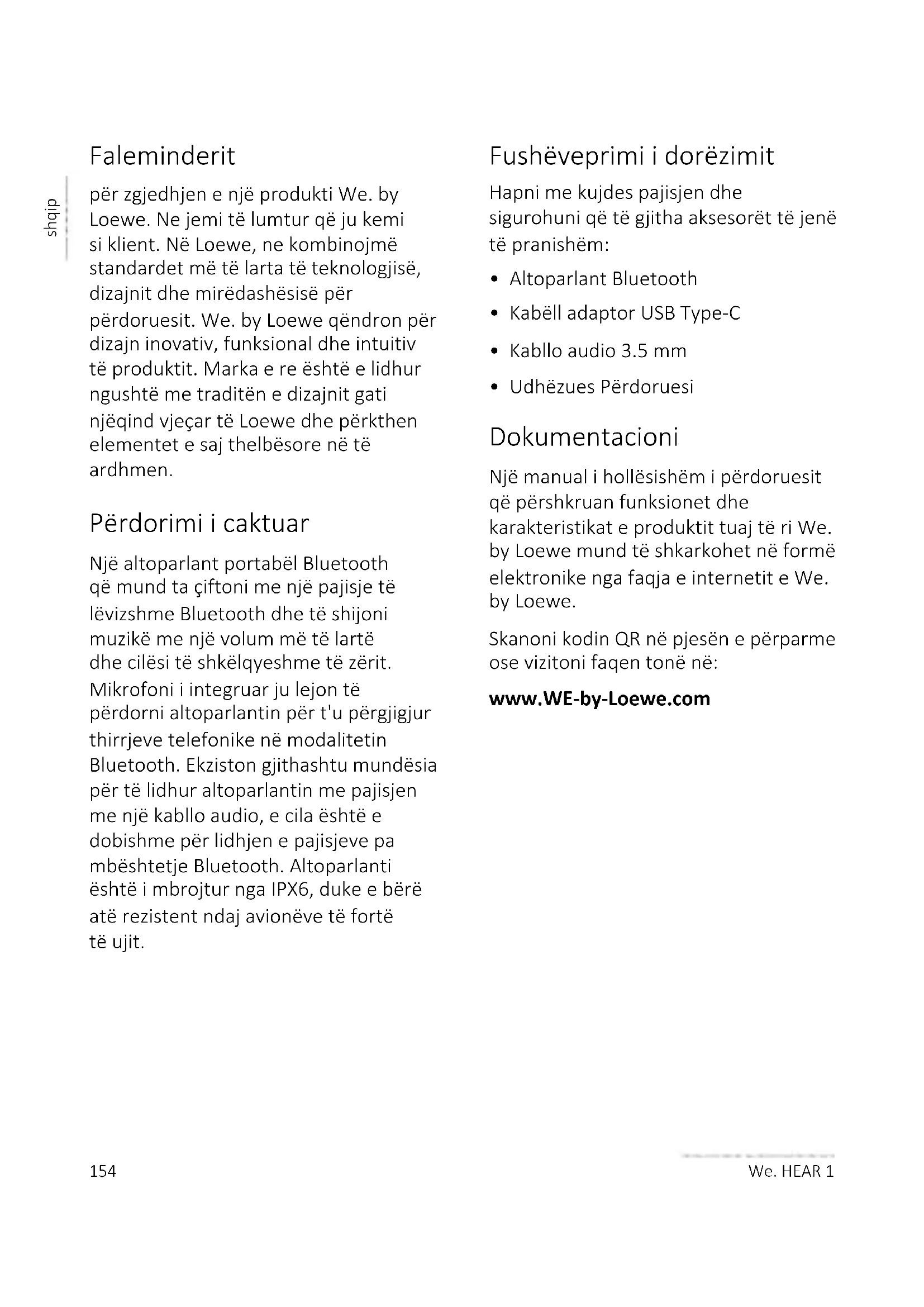 - Udhëzues Përdoruesi Dokumentacioni Një manual i hollësishëm i përdoruesit që përshkruan funksionet dhe karakteristikat e produktit tuaj të ri We. by Loewe mund të shkarkohet në formë elektronike nga faqja e internetit e We. by Loewe. Skanoni kodin QR në pjesën e përparme ose vizitoni faqen tonë në: www.WE-by-Loewe.com155 shqip We. HEAR 1 1 Siguri e rëndësishme iudhëzimet Kujdes: Lexoni me kujdes këtë faqe për të siguruar funksionimin e sigurt të pajisjes. Shpjegimi i simboleve Ky simbol tregon rreziqet e shkaktuara nga tensionet e larta. Ky simbol është për të paralajmëruar përdoruesin për rreziqe të tjera, më specifike. Ky simbol tregon rreziqet e shkaktuara nga zhvillimi i zjarrit.
