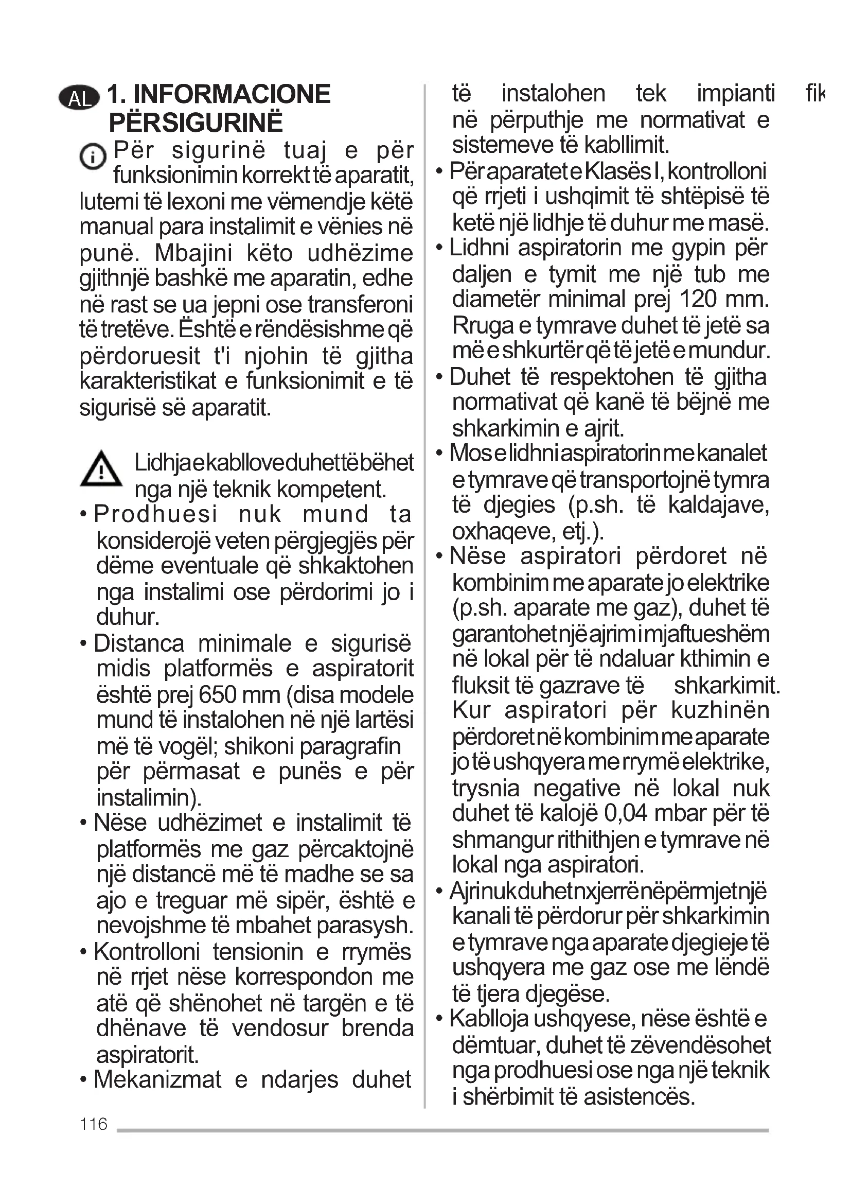 - Duhet të jetë i pranishëm një ajrim i mjaftueshëm në lokal kur aspiratori përdoret njëkohësisht me aparate që përdorin gaz ose lëndë të tjera djegëse (nuk mund t'u vihet aparateve që shkarkojnë vetëm ajrin në lokal).