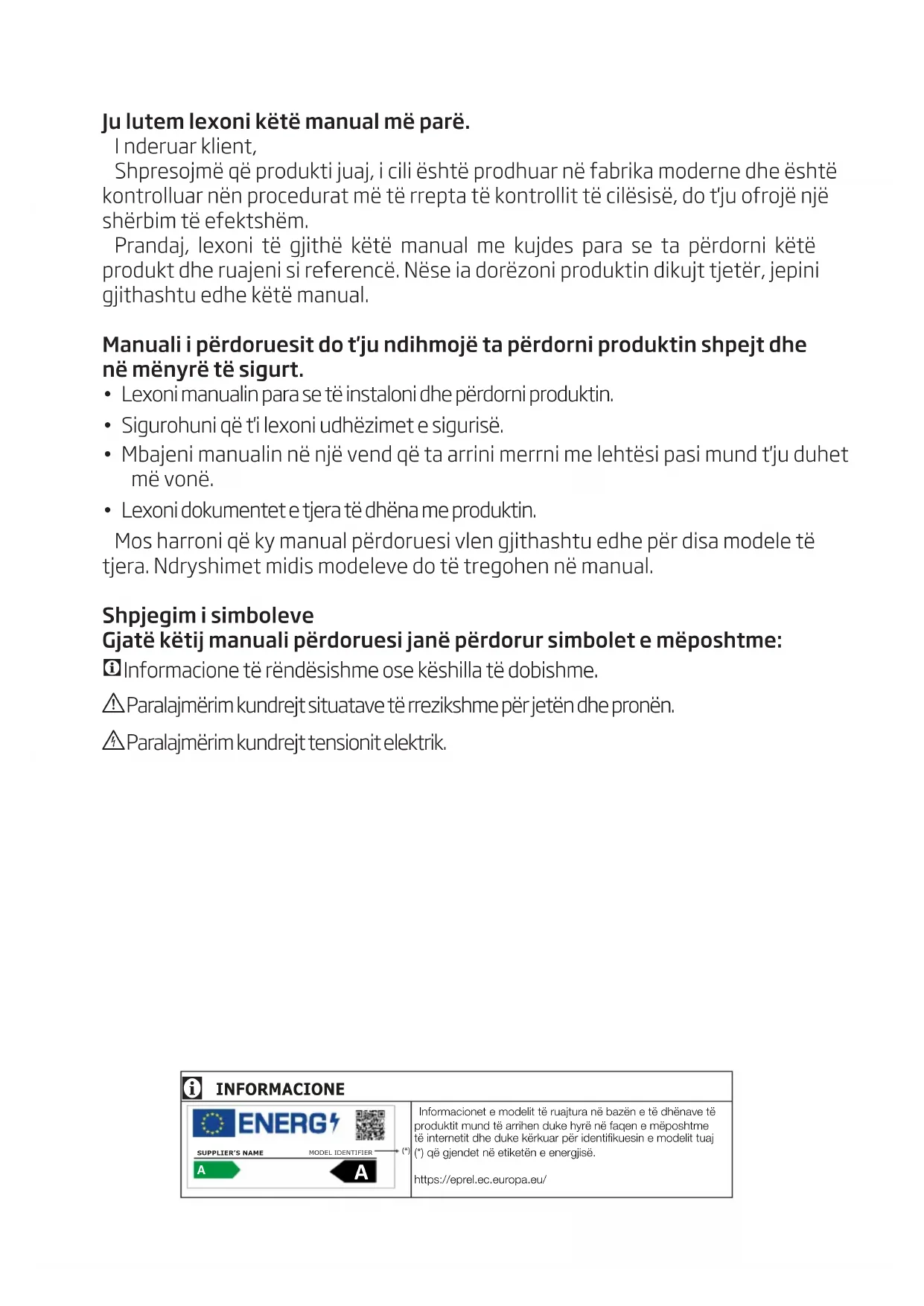 Informacionet e modelit të ruajtura në bazën e të dhënave të produktit mund të arrihen duke hyrë në faqen e mëposhtme të internetit dhe duke kërkuar për identifikuesin e modelit tuaj (*) që gjendet në etiketën e energjisë.https://eprel.ec.europa.eu/