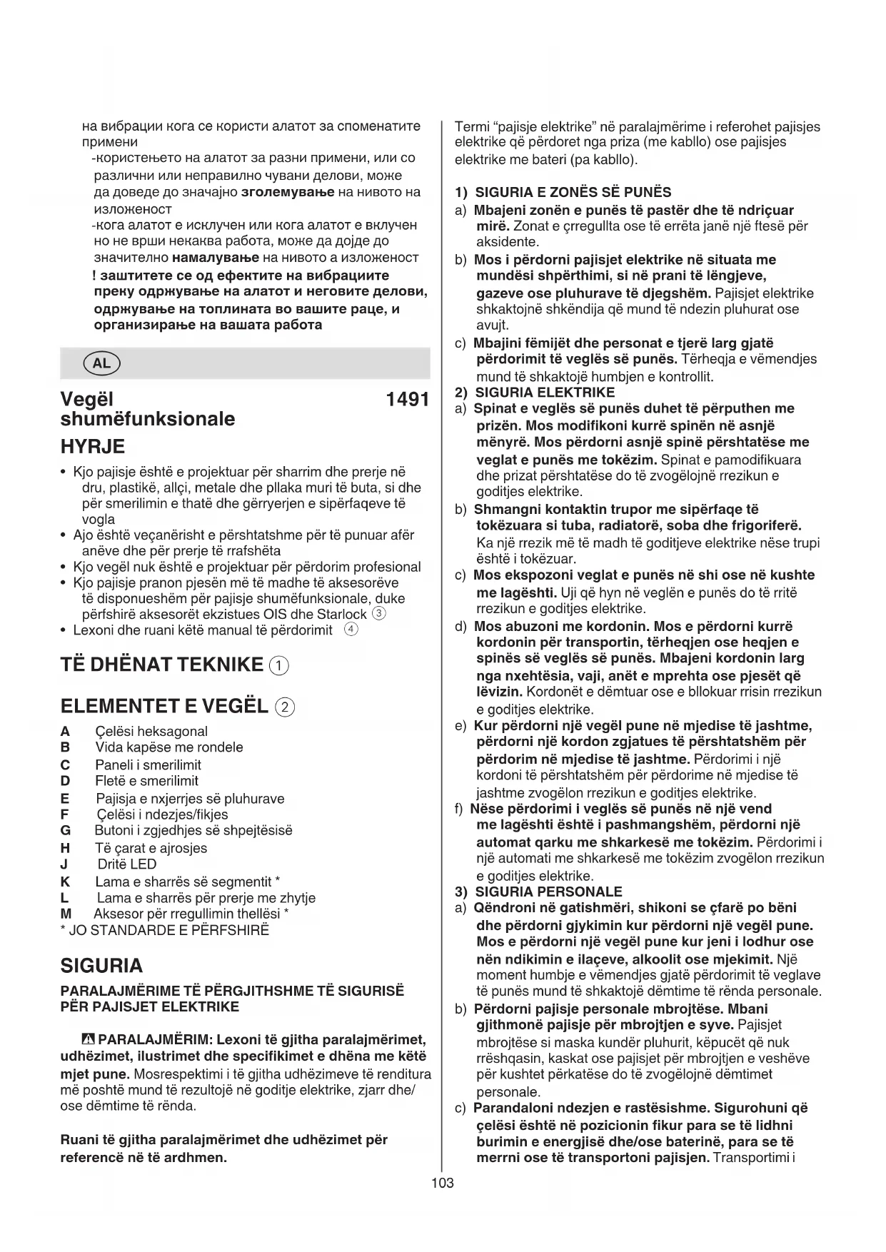- Kurrë mos e përdorni pajisjen kur kordoni është i dëmtuar; ai duhet të zëvendësohet nga një kordon i veçantë që disponohet në qendrat e servisit veglave të punës me gishtin në çelës ose aktivizimi i veglave të punës që kanë çelësin të ndezur është një ftesë për aksidente. d) Hiqni çdo çelës ose çelës përshtatës para ndezjes së veglës së punës. Një çelës i lënë i lidhur me një pjesë rrotulluese të veglës së punës mund të shkaktojë dëmtime personale. e) Mos u zgjasni. Mbani një vendosje të mirë të këmbëve dhe një ekuilibër të mirë në çdo moment. Kjo gjë bën të mundur një kontroll më të mirë të veglës së punës në situata të papritura. f) Vishuni në mënyrën e duhur. Mos vishni veshje të gjera ose bizhuteri. Mbani okët, veshjet dhe dorashkat larg nga pjesët lëvizëse. Veshjet e gjera, bizhuteritë ose okët e gjatë mund të kapen nga pjesët në lëvizje. g) Nëse janë ofruar pajisje për lidhjen e pajisjeve të mbledhjes dhe nxjerrjes së pluhurave, sigurohuni që ato të jenë të lidhura dhe të përdoren si duhet. Përdorimi i mbledhjes së pluhurave mund të zvogëlojë rreziqet në lidhje me pluhurat. h) Mos lejoni që familjarizimi i tuar nga përdorimi i shpeshtë i veglave t’ju lejojë të tregoheni të vetëkënaqur dhe të shpërllni parimet e sigurisë për pajisjet. Një veprim i pakujdesshëm mund të shkaktojë dëmtime të rënda në më pak se një sekondë.