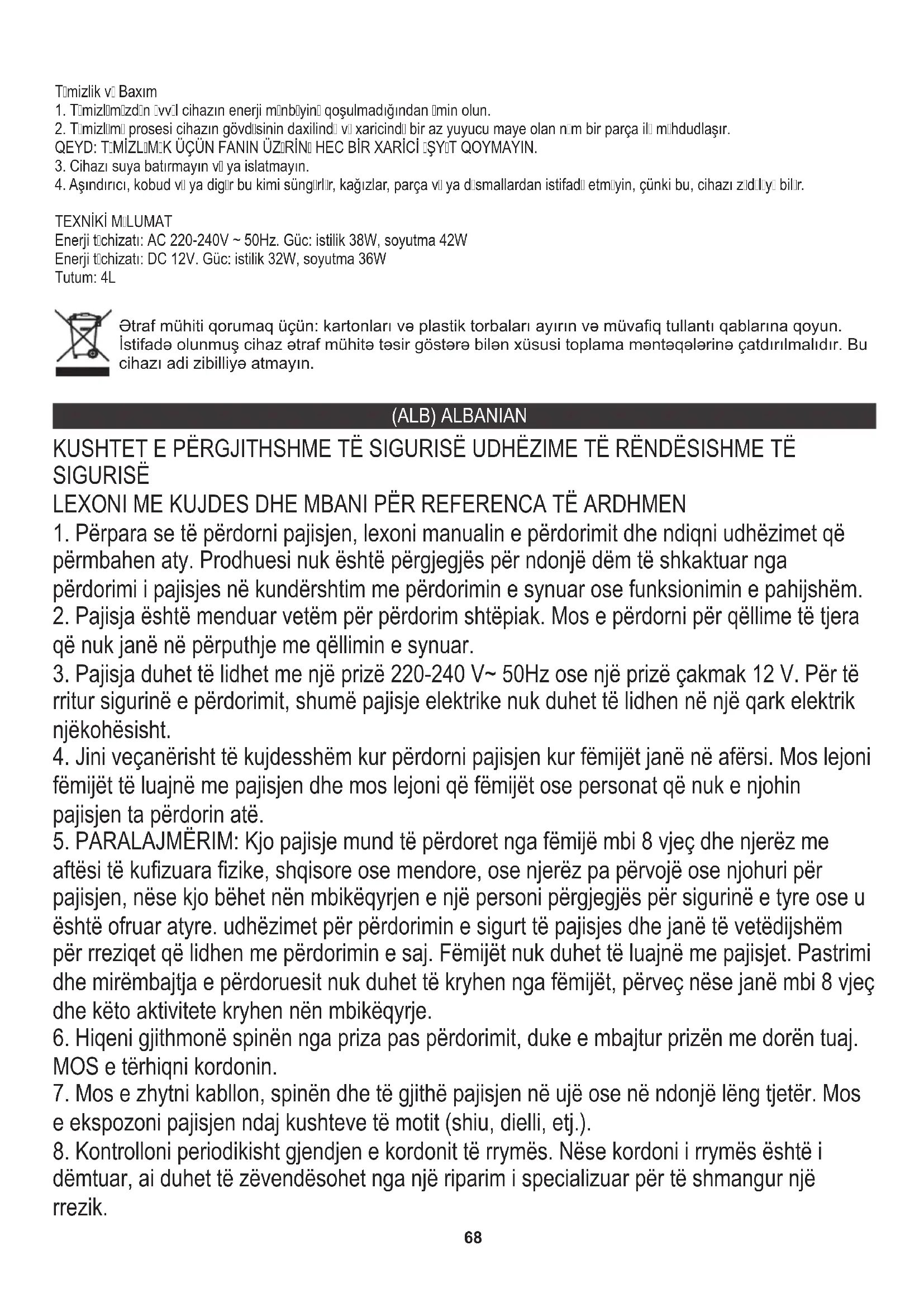 Pastrimi dhe mirëmbajtja 4. Mos përdorni sfungjerë, letra, lecka ose peshqir gërryes, të ashpër ose të tjerë të tillë, pasi mund të dëmtojë pajisjen. Për të mbrojtur mjedisin: ndani kartonat dhe qeset plastike dhe vendosini në kontejnerët e duhur të mbeturinave. Pajisja e përdorur duhet të dorëzohet në pika të veçanta grumbullimi që mund të ndikojnë në mjedis. Mos e hidhni këtë pajisje në mbeturina normale. უსაფრთხოების ზოგადი პირობები უსაფრთხოების მნიშვნელოვანი ინსტრუქციები