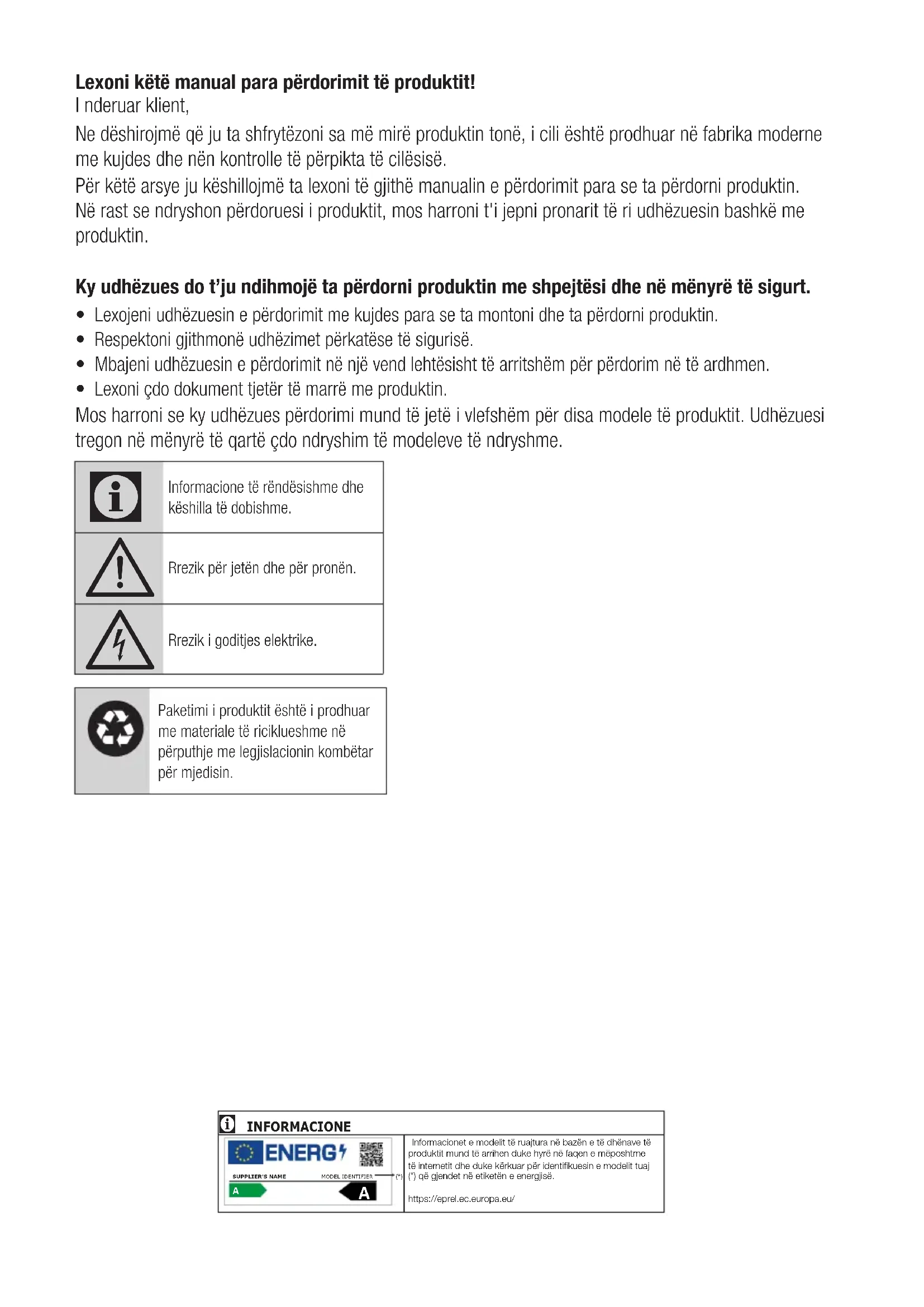 Informacione të rëndësishme dhe këshilla të dobishme. Rrezik për jetën dhe për pronën. Rrezik i goditjes elektrike.Paketimi i produktit është i prodhuar me materiale të riciklueshme në përputhje me legjislacionin kombëtar për mjedisin.INFORMACIONE Informacionet e modelit të ruajtura në bazën e të dhënave të produktit mund të arrihen duke hyrë në faqen e mëposhtme të internetit dhe duke kërkuar për identifikuesin e modelit tuaj (*) që gjendet në etiketën e energjisë.https://eprel.ec.europa.eu/