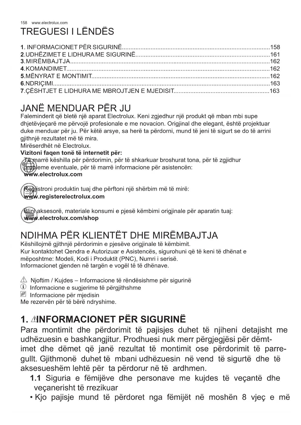 Faleminderit që bletë një aparat Electrolux. Keni zgjedhur një produkt që mban mbi supe dhjetëvjeçarë me përvojë profesionale e me novacion. Origjinal dhe elegant, është projektuar duke menduar për ju. Për këtë arsye, sa herë ta përdorni, mund të jeni të sigurt se do të arrini gjithnjë rezultatet më të mira. Mirëserdhët në Electrolux. Vizitoni faqen tonë të internetit për: Të marrë këshilla për përdorimin, për të shkarkuar broshurat tona, për të zgjidhur probleme eventuale, për të marrë informacione për asistencën: www.electrolux.com Regjistroni produktin tuaj dhe përftoni një shërbim më të mirë: www.registerelectrolux.com Blini aksesorë, materiale konsumi e pjesë këmbimi origjinale për aparatin tuaj: www.electrolux.com/shop NDIHMA PËR KLIENTËT DHE MIRËMBAJTJA Këshillojmë gjithnjë përdorimin e pjesëve origjinale të këmbimit. Kur kontaktohet Qendra e Autorizuar e Asistencës, sigurohuni që të keni të dhënat e mëposhtme: Modeli, Kodi i Produktit (PNC), Numri i serisë. Informacionet gjenden në targën e vogël të të dhënave. Njoftim / Kujdes – Informacione të rëndësishme për sigurinë Informacione e sugjerime të përgjithshme Informacione për mjedisin Me rezervën për të bërë ndryshime.
