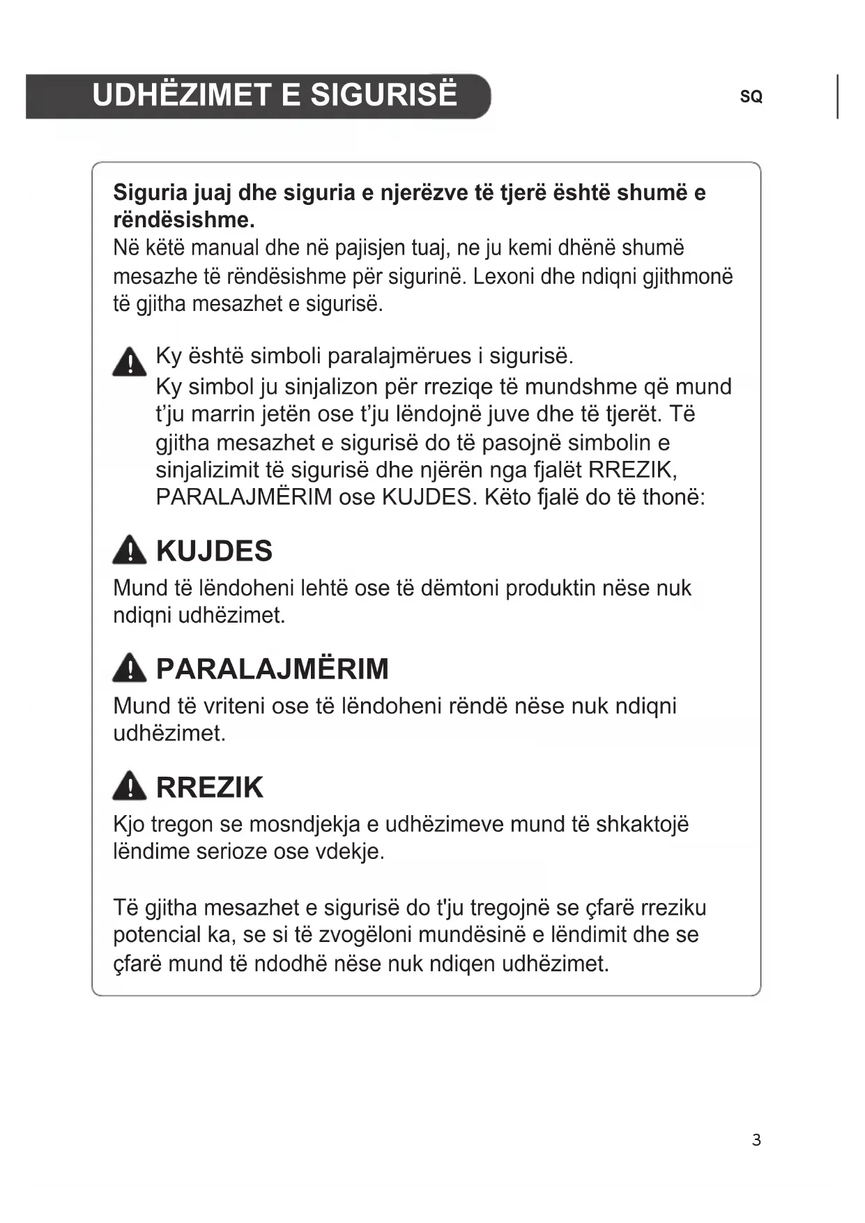 Siguria juaj dhe siguria e njerëzve të tjerë është shumë e rëndësishme. Në këtë manual dhe në pajisjen tuaj, ne ju kemi dhënë shumë mesazhe të rëndësishme për sigurinë. Lexoni dhe ndiqni gjithmonë të gjitha mesazhet e sigurisë. Ky është simboli paralajmërues i sigurisë. Ky simbol ju sinjalizon për rreziqe të mundshme që mund t’ju marrin jetën ose t’ju lëndojnë juve dhe të tjerët. Të gjitha mesazhet e sigurisë do të pasojnë simbolin e sinjalizimit të sigurisë dhe njërën nga fjalët RREZIK, PARALAJMËRIM ose KUJDES. Këto fjalë do të thonë: KUJDES Mund të lëndoheni lehtë ose të dëmtoni produktin nëse nuk ndiqni udhëzimet. PARALAJMËRIM Mund të vriteni ose të lëndoheni rëndë nëse nuk ndiqni udhëzimet. RREZIK Kjo tregon se mosndjekja e udhëzimeve mund të shkaktojë lëndime serioze ose vdekje. Të gjitha mesazhet e sigurisë do t'ju tregojnë se çfarë rreziku potencial ka, se si të zvogëloni mundësinë e lëndimit dhe se çfarë mund të ndodhë nëse nuk ndiqen udhëzimet.