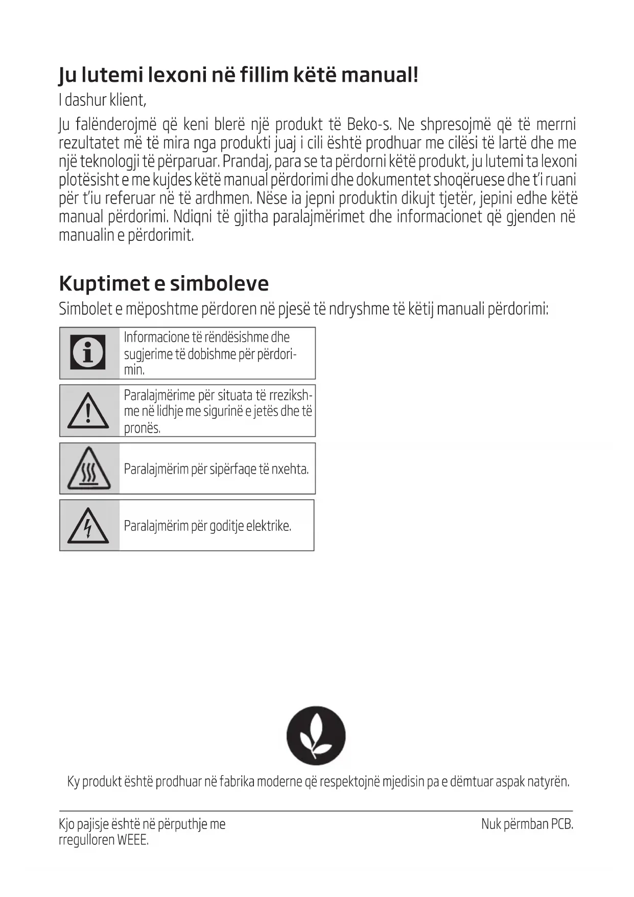 Mangelfuld vedligehold eller behandling i strid med brugervejledning. Indgreb og reparationer udført af uautoriseret personel, eller brug af uoriginale reservedele. Unormale spændingsvariationer lynnedslag, elektriske forstyrrelser eller evt. uregelmæssigheder i vandforsyningen. Reservedele. Information om bestilling af reservedele finder du på: www.grundig.dk Ved bestilling af reservedele må modelbetegnelse og serienummer på produktet oplyses. Denne information findes på typeskiltet på produktet. Anmodning om service. Grundig har lokale serviceværksteder over hele landet. Ved tekniske henvendelser må følgende information opgives / fremvises: Navn Adresse Telefon Modelbetegnelse Serienummer Kjøbsdato / Købskvittering Fejlbeskrivelse Grundig Nordic No As Glynitveien 25 1400 Ski - NO Tlf +45 70 80 87 77 hvidevareservice@grundig.com www.grundig.dkJu lutemi lexoni në fillim këtë manual! I dashur klient, Ju falënderojmë që keni blerë një produkt të Beko-s. Ne shpresojmë që të merrni rezultatet më të mira nga produkti juaj i cili është prodhuar me cilësi të lartë dhe me një teknologji të përparuar. Prandaj, para se ta përdorni këtë produkt, ju lutemi ta lexoni plotësisht e me kujdes këtë manual përdorimi dhe dokumentet shoqëruese dhe t’i ruani për t’iu referuar në të ardhmen. Nëse ia jepni produktin dikujt tjetër, jepini edhe këtë manual përdorimi. Ndiqni të gjitha paralajmërimet dhe informacionet që gjenden në manualin e përdorimit. Kuptimet e simboleve Simbolet e mëposhtme përdoren në pjesë të ndryshme të këtij manuali përdorimi:
