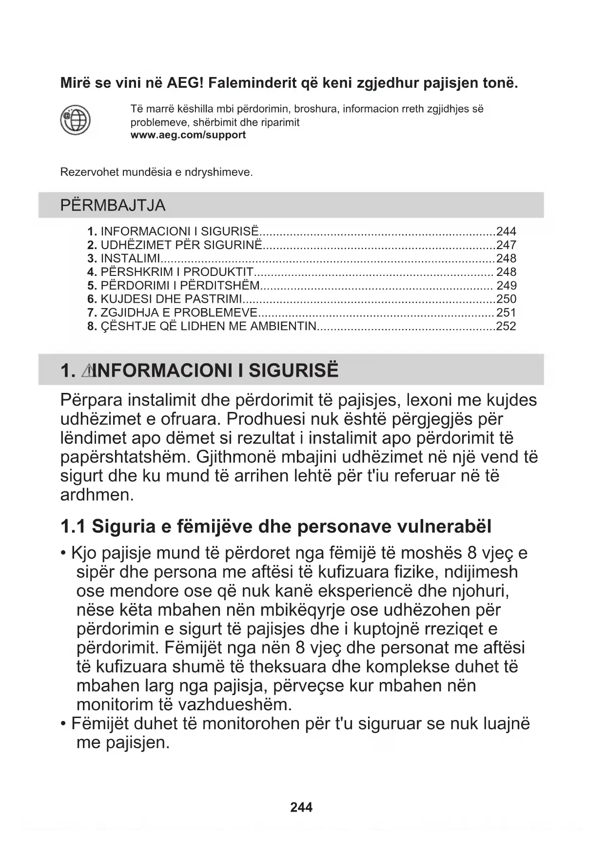 - Kjo pajisje mund të përdoret nga fëmijë të moshës 8 vjeç e sipër dhe persona me aftësi të kufizuara fizike, ndijimesh ose mendore ose që nuk kanë eksperiencë dhe njohuri, nëse këta mbahen nën mbikëqyrje ose udhëzohen për përdorimin e sigurt të pajisjes dhe i kuptojnë rreziqet e përdorimit. Fëmijët nga nën 8 vjeç dhe personat me aftësi të kufizuara shumë të theksuara dhe komplekse duhet të mbahen larg nga pajisja, përveçse kur mbahen nën monitorim të vazhdueshëm.