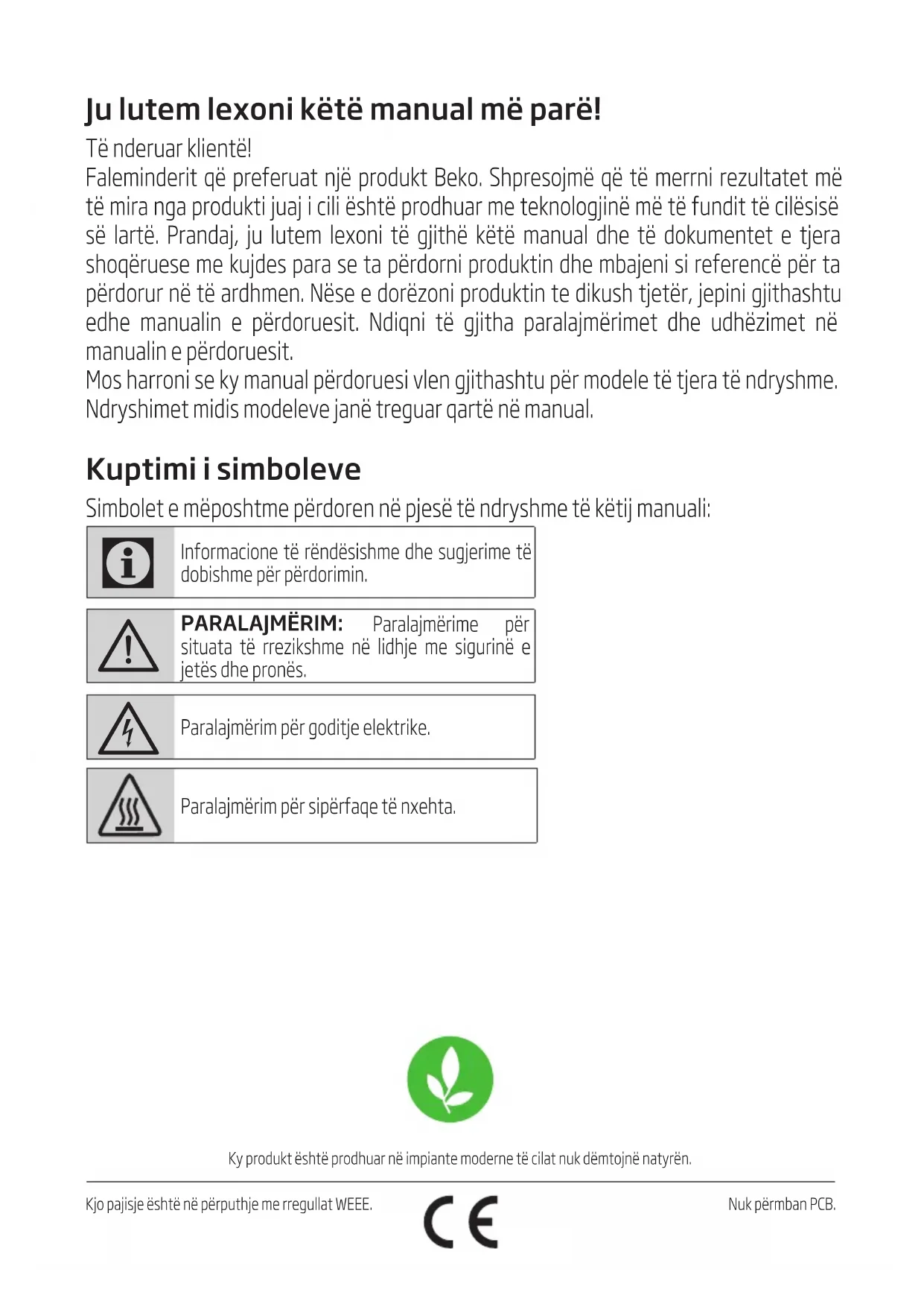 Уверете се дека сијаличката е студена пред да ја допрете.Заменете ја прегорената сијаличка. Користете само LED сијалички E14 од макс. 3W. За повеќе детали, погледнете го приложениот памфлет “ILCOS D” (алфанумеричка позиција “1d”).Ако треба да го транспортирате производот:-Производот чувајте го во неговата оригинална амбалажа. Транспортирајте го производот во неговата оригинална амбалажа и следете ги ознаките за транспорт на неа.Ако веќе не ја поседувате оригиналната амбалажа:-Не ставајте предмети врз хаубата.-Заштитете ја надворешната површина од удари.-Спакувајте го производот така што нема да се оштети за време на транспортот.Ky produkt është prodhuar në impiante moderne të cilat nuk dëmtojnë natyrën.Kjo pajisje është në përputhje me rregullat WEEE.Nuk përmban PCB. Ju lutem lexoni këtë manual më parë! Të nderuar klientë! Faleminderit që preferuat një produkt Beko. Shpresojmë që të merrni rezultatet më të mira nga produkti juaj i cili është prodhuar me teknologjinë më të fundit të cilësisë së lartë. Prandaj, ju lutem lexoni të gjithë këtë manual dhe të dokumentet e tjera shoqëruese me kujdes para se ta përdorni produktin dhe mbajeni si referencë për ta përdorur në të ardhmen. Nëse e dorëzoni produktin te dikush tjetër, jepini gjithashtu edhe manualin e përdoruesit. Ndiqni të gjitha paralajmërimet dhe udhëzimet në manualin e përdoruesit. Mos harroni se ky manual përdoruesi vlen gjithashtu për modele të tjera të ndryshme. Ndryshimet midis modeleve janë treguar qartë në manual. Kuptimi i simboleve Simbolet e mëposhtme përdoren në pjesë të ndryshme të këtij manuali: