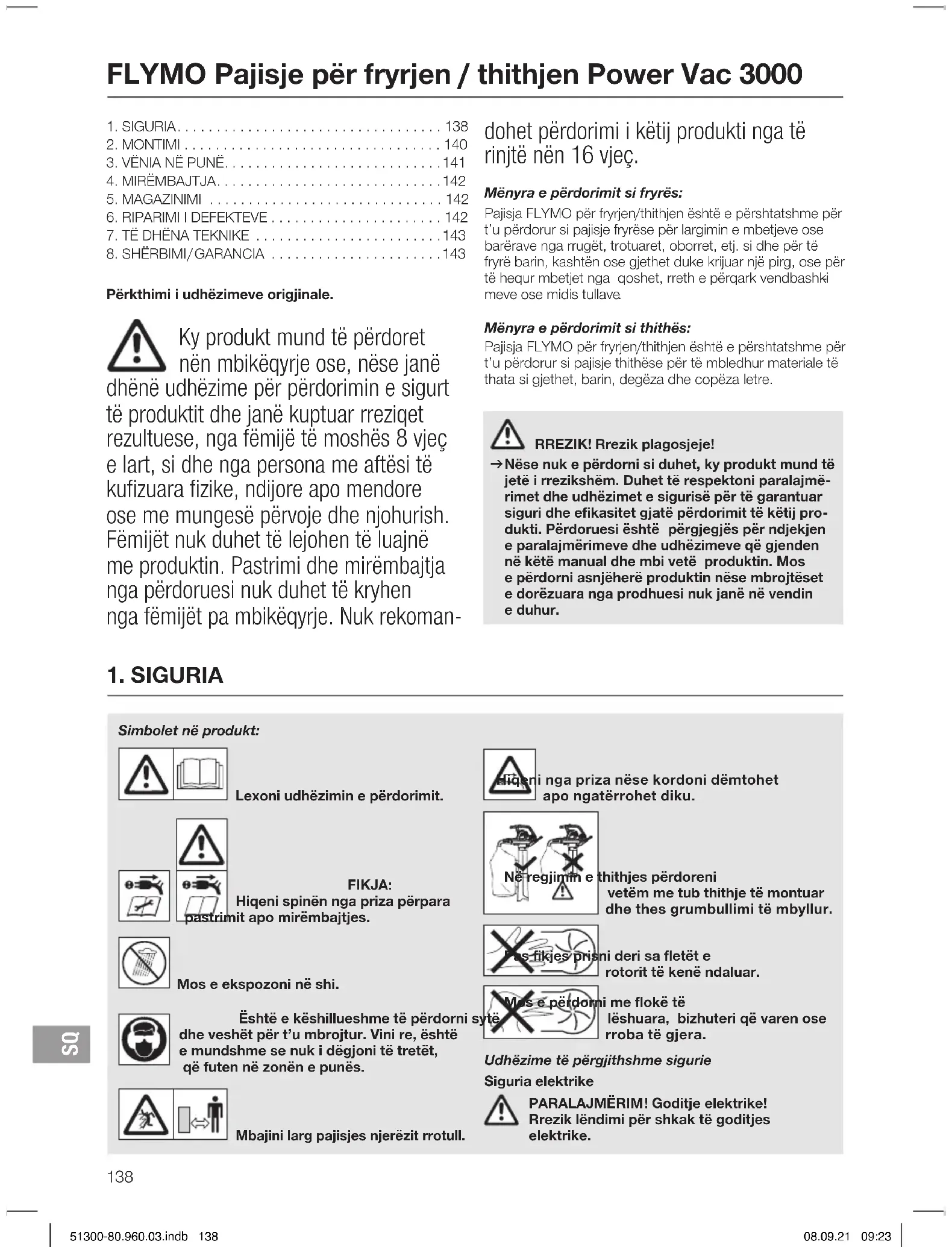 Lexoni udhëzimin e përdorimit. FIKJA: Hiqeni spinën nga priza përpara pastrimit apo mirëmbajtjes. Mos e ekspozoni në shi. Është e këshillueshme të përdorni sytë dhe veshët për t’u mbrojtur. Vini re, është e mundshme se nuk i dëgjoni të tretët, që futen në zonën e punës. Mbajini larg pajisjes njerëzit rrotull. Hiqeni nga priza nëse kordoni dëmtohet apo ngatërrohet diku. Në regjimin e thithjes përdoreni vetëm me tub thithje të montuar dhe thes grumbullimi të mbyllur. Pas fikjes prisni deri sa fletët e rotorit të kenë ndaluar. Mos e përdorni me flokë të lëshuara, bizhuteri që varen ose rroba të gjera. Udhëzime të përgjithshme sigurie Siguria elektrike PARALAJMËRIM ! Goditje elektrike! Rrezik lëndimi për shkak të goditjes elektrike. Simbolet në produkt: