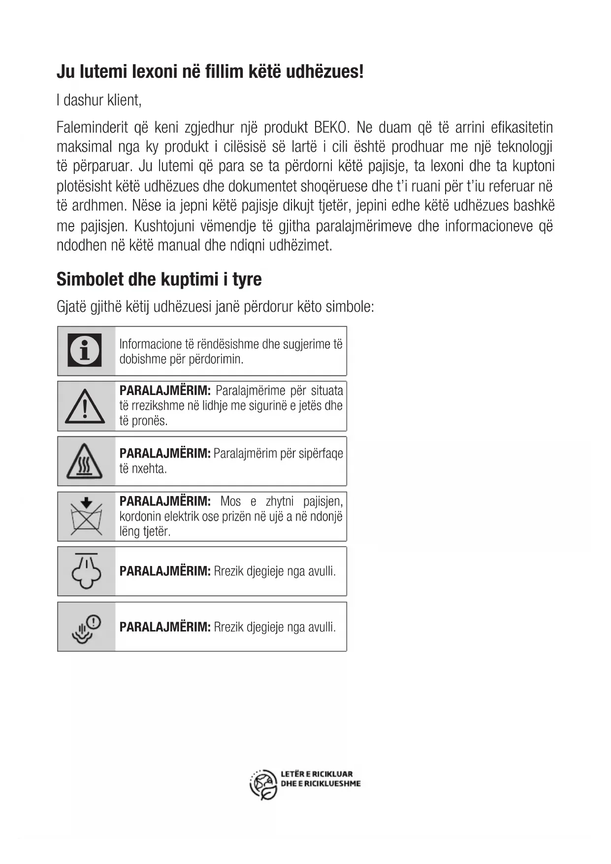 - Që pajisja të përdoret nga persona me aftësi të kufizuara fizike, emocionale ose mendore ose me mungesë njohurie dhe eksperience, si dhe nga fëmijët mbi 8 vjeç, këta persona duhet të jenë nën mbikëqyrje dhe të kenë kuptuar udhëzimet për përdorimin e sigurt të pajisjes dhe për rreziqet e mundshme. Fëmijët nuk duhet ta ngacmojnë pajisjen. Veprimet për pastrimin dhe mirëmbajtjen si përdorues nuk duhet të kryhen nga fëmijët përveçse kur janë të mbikëqyrur.