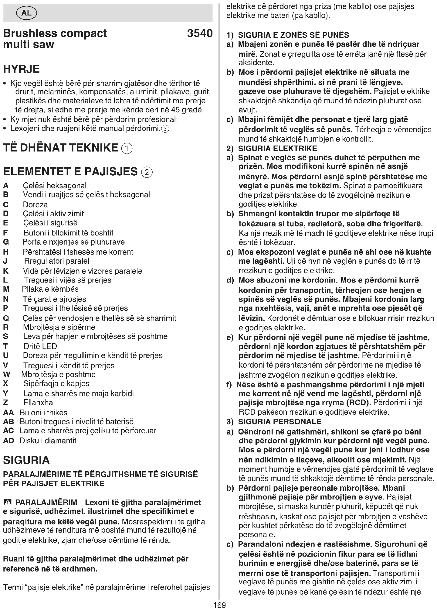 P Treguesi i thellësisë së prerjes Q Çelës për vendosjen e thellësisë së sharrimit R Mbrojtësja e sipërme S Leva për hapjen e mbrojtëses së poshtme T Dritë LED U Doreza për rregullimin e këndit të prerjes V Treguesi i këndit të prerjes W Mbrojtësja e poshtme X Sipërfaqja e kapjes Y Lama e sharrës me maja karbidi Z Fllanxha AA Buloni i thikës AB Butoni tregues i nivelit të baterisë AC Lama e sharrës prej çeliku të përforcuar AD Disku i diamantit SIGURIA PARALAJMËRIME TË PËRGJITHSHME TË SIGURISË