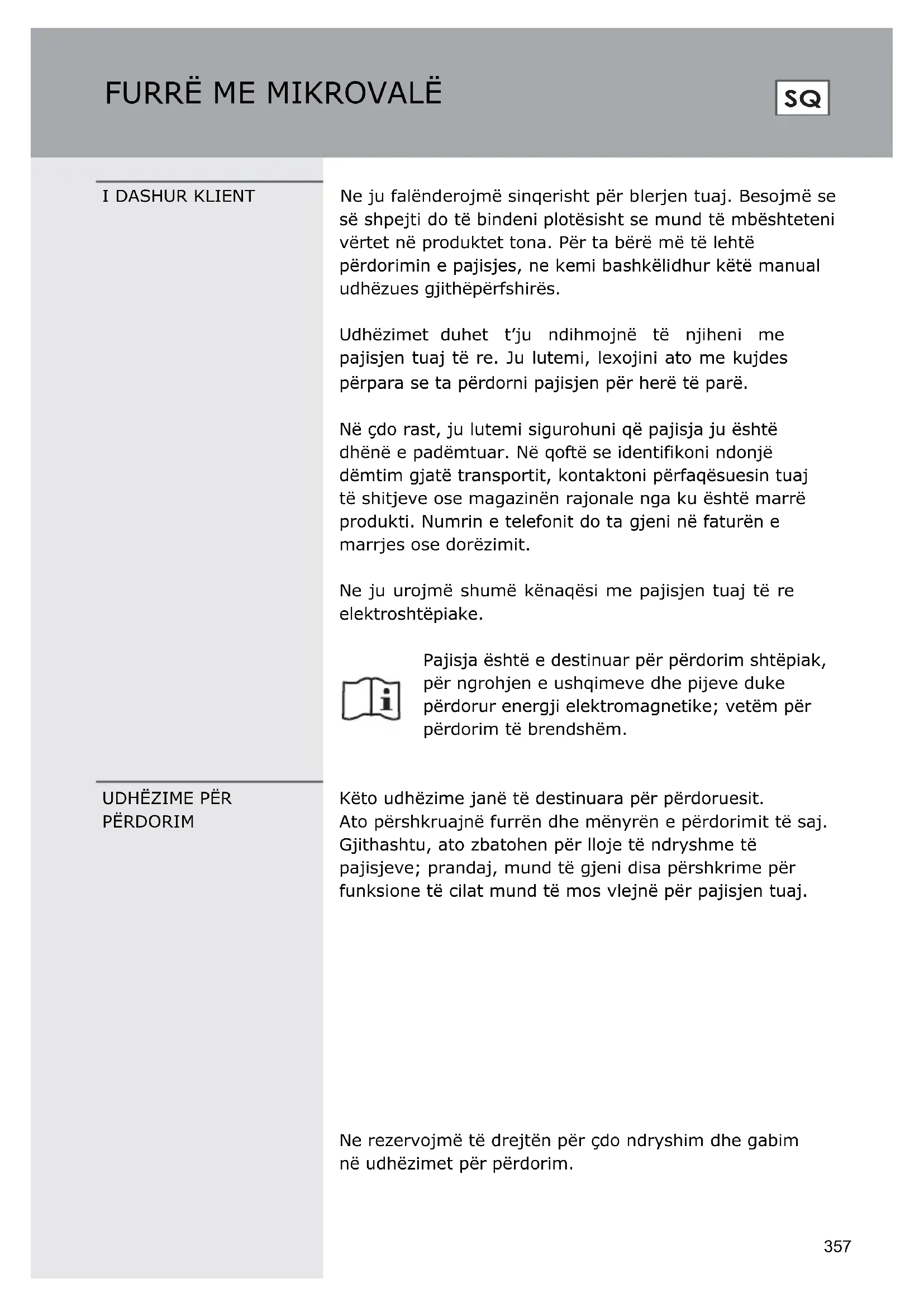 I DASHUR KLIENT Ne ju falënderojmë sinqerisht për blerjen tuaj. Besojmë se së shpejti do të bindeni plotësisht se mund të mbështeteni vërtet në produktet tona. Për ta bërë më të lehtë përdorimin e pajisjes, ne kemi bashkëlidhur këtë manual udhëzues gjithëpërfshirës. Udhëzimet duhet t’ju ndihmojnë të njiheni me pajisjen tuaj të re. Ju lutemi, lexojini ato me kujdes përpara se ta përdorni pajisjen për herë të parë. Në çdo rast, ju lutemi sigurohuni që pajisja ju është dhënë e padëmtuar. Në qoftë se identifikoni ndonjë dëmtim gjatë transportit, kontaktoni përfaqësuesin tuaj të shitjeve ose magazinën rajonale nga ku është marrë produkti. Numrin e telefonit do ta gjeni në faturën e marrjes ose dorëzimit. Ne ju urojmë shumë kënaqësi me pajisjen tuaj të re elektroshtëpiake. Pajisja është e destinuar për përdorim shtëpiak, për ngrohjen e ushqimeve dhe pijeve duke përdorur energji elektromagnetike; vetëm për përdorim të brendshëm.