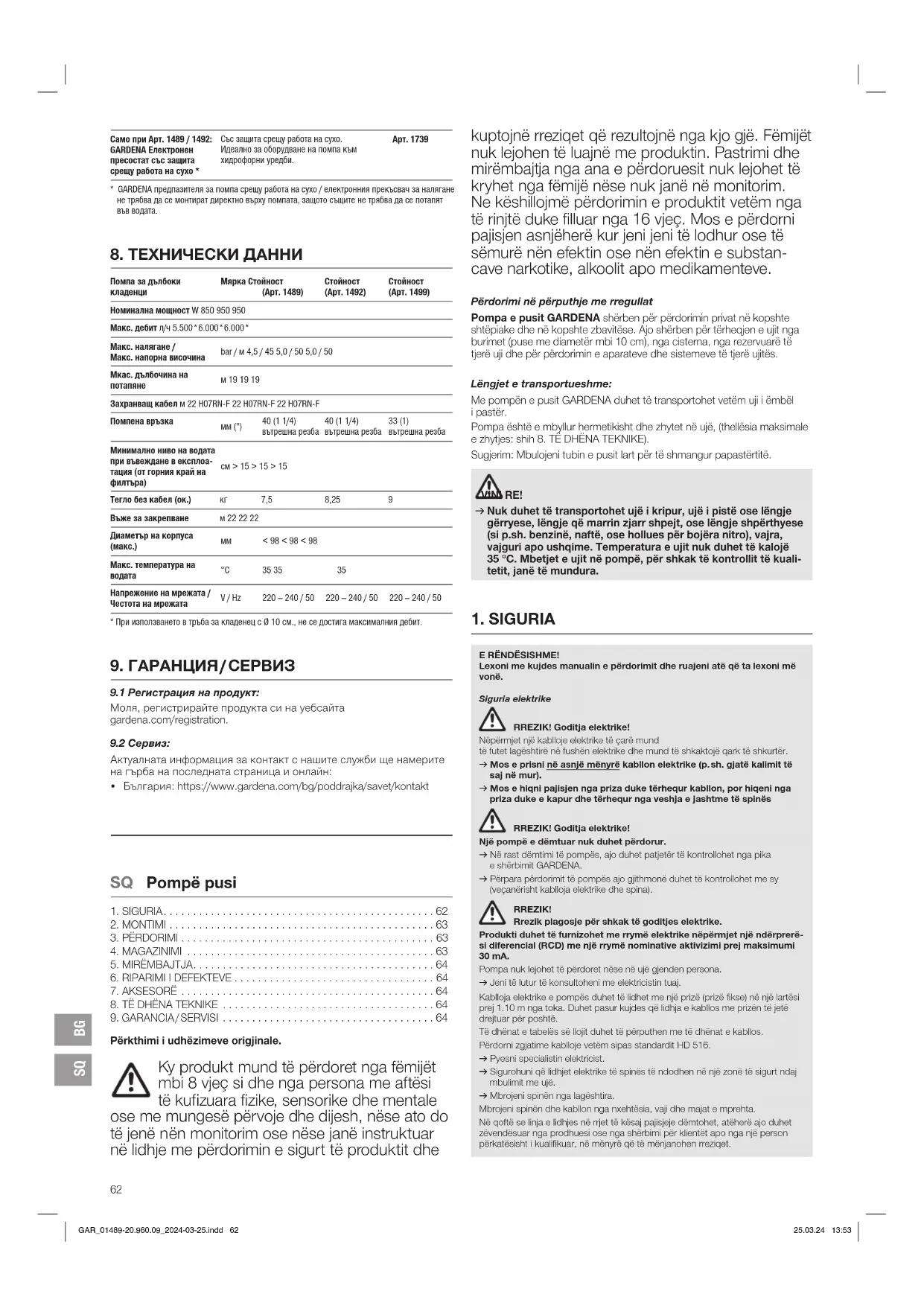 Heqja nga puna: Produkti duhet të ruhet në vende jo të aksesueshme nga fëmijët. v Në rast rreziku nga ngricat, pompa duhet të magazinohet në një vend të mbrojtur nga ngricat. Hedhja: (në përputhje me RL2012/19/EU) Produkti nuk lejohet të hidhet me mbetjet normale të shtëpisë. Ai duhet të hidhet në përputhje me rregulloret lokale të mbrojtjes së mjedisit. E RËNDËSISHME! v Hidheni produktin nëpërmjet qendrës tuaj vendore të grumbullimit dhe riciklimit. GAR_01489-20.960.09_2024-03-25.indd 63GAR_01489-20.960.09_2024-03-25.indd 63 25.03.24 13:5325.03.24 13:53SQ