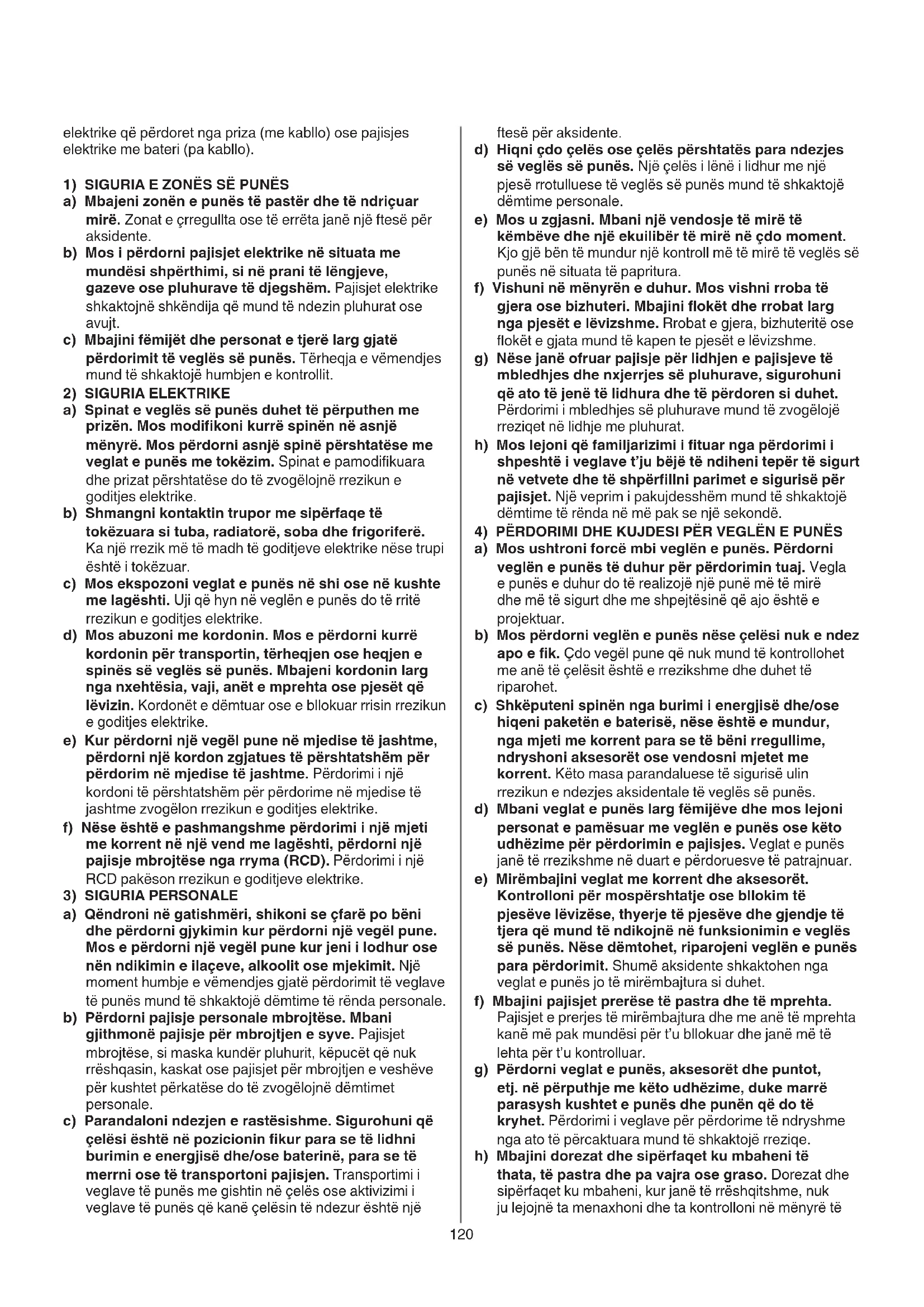 a) Mos ushtroni forcë mbi veglën e punës. Përdorni veglën e punës të duhur për përdorimin tuaj. Vegla e punës e duhur do të realizojë një punë më të mirë dhe më të sigurt dhe me shpejtësinë që ajo është e projektuar. b) Mos përdorni veglën e punës nëse çelësi nuk e ndez apo e k. Çdo vegël pune që nuk mund të kontrollohet me anë të çelësit është e rrezikshme dhe duhet të riparohet. c) Shkëputeni spinën nga burimi i energjisë dhe/ose hiqeni paketën e baterisë, nëse është e mundur, nga mjeti me korrent para se të bëni rregullime, ndryshoni aksesorët ose vendosni mjetet me korrent. Këto masa parandaluese të sigurisë ulin rrezikun e ndezjes aksidentale të veglës së punës. d) Mbani veglat e punës larg fëmijëve dhe mos lejoni personat e pamësuar me veglën e punës ose këto udhëzime për përdorimin e pajisjes. Veglat e punës janë të rrezikshme në duart e përdoruesve të patrajnuar. e) Mirëmbajini veglat me korrent dhe aksesorët. Kontrolloni për mospërshtatje ose bllokim të pjesëve lëvizëse, thyerje të pjesëve dhe gjendje të tjera që mund të ndikojnë në funksionimin e veglës së punës. Nëse dëmtohet, riparojeni veglën e punës para përdorimit. Shumë aksidente shkaktohen nga veglat e punës jo të mirëmbajtura si duhet. f) Mbajini pajisjet prerëse të pastra dhe të mprehta. Pajisjet e prerjes të mirëmbajtura dhe me anë të mprehta kanë më pak mundësi për t’u bllokuar dhe janë më të lehta për t’u kontrolluar. g) Përdorni veglat e punës, aksesorët dhe puntot, etj. në përputhje me këto udhëzime, duke marrë parasysh kushtet e punës dhe punën që do të kryhet. Përdorimi i veglave për përdorime të ndryshme nga ato të përcaktuara mund të shkaktojë rreziqe. h) Mbajini dorezat dhe sipërfaqet ku mbaheni të thata, të pastra dhe pa vajra ose graso. Dorezat dhe sipërfaqet ku mbaheni, kur janë të rrëshqitshme, nuk ju lejojnë ta menaxhoni dhe ta kontrolloni në mënyrë të elektrike që përdoret nga priza (me kabllo) ose pajisjes elektrike me bateri (pa kabllo).