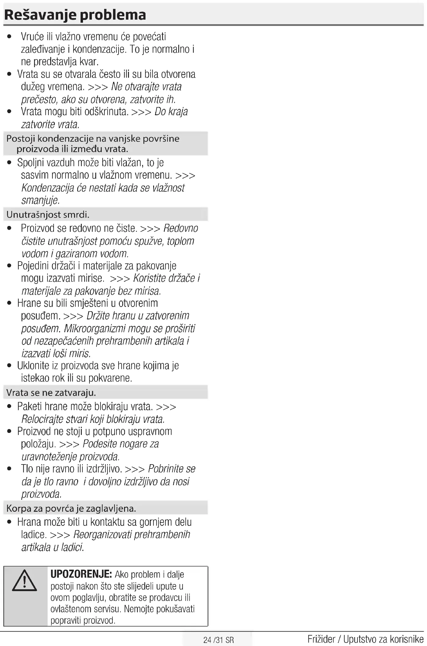 - Sasi të mëdha ushqimesh të nxehta mund të jenë vendosur në produkt së fundi. >>> Mos vendosni ushqime të nxehta te produkti. Dridhje ose zhurmë.26 /29 SQ Frigorifer / Manuali i përdorimit Zgjidhja e problemeve