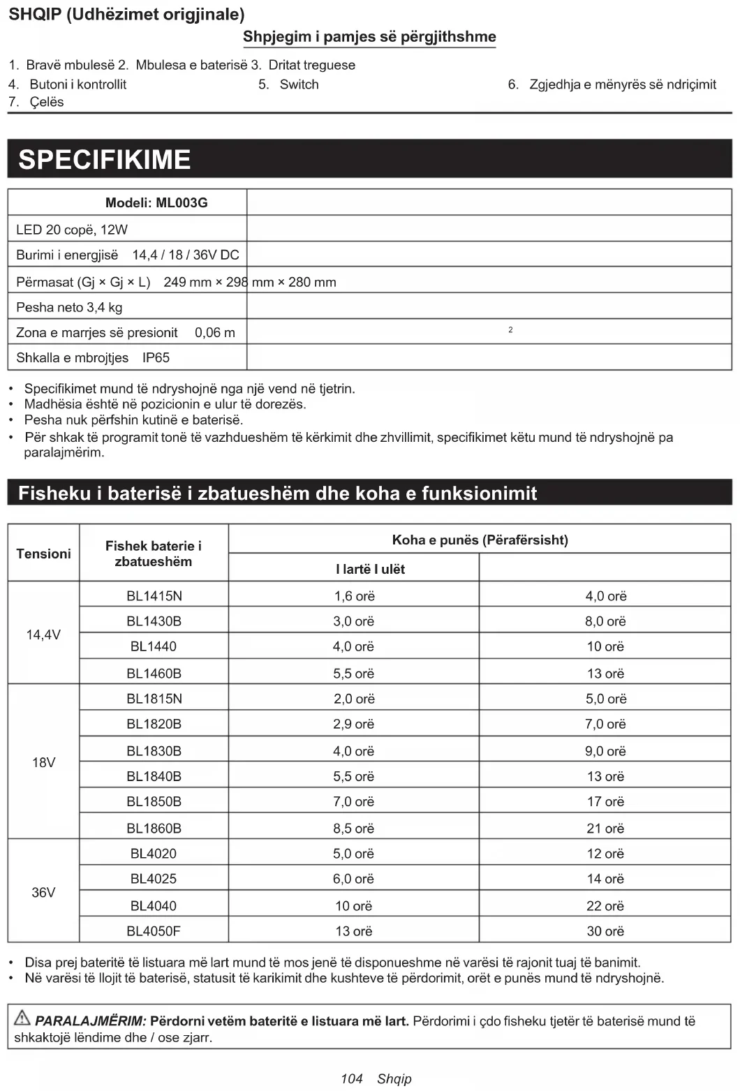 - Përshkaktëprogramittonëtëvazhdueshëmtëkërkimitdhezhvillimit,specikimetkëtumundtëndryshojnëpa paralajmërim. Fisheku i baterisë i zbatueshëm dhe koha e funksionimit Tensioni Fishek baterie i zbatueshëm Koha e punës (Përafërsisht) I lartë I ulët 14,4V BL1415N 1,6 orë 4,0 orë BL1430B 3,0 orë 8,0 orë BL1440 4,0 orë 10 orë BL1460B 5,5 orë 13 orë 18V BL1815N 2,0 orë 5,0 orë BL1820B 2,9 orë 7,0 orë BL1830B 4,0 orë 9,0 orë BL1840B 5,5 orë 13 orë BL1850B 7,0 orë 17 orë BL1860B 8,5 orë 21 orë 36V BL4020 5,0 orë 12 orë BL4025 6,0 orë 14 orë BL4040 10 orë 22 orë BL4050F 13 orë 30 orë