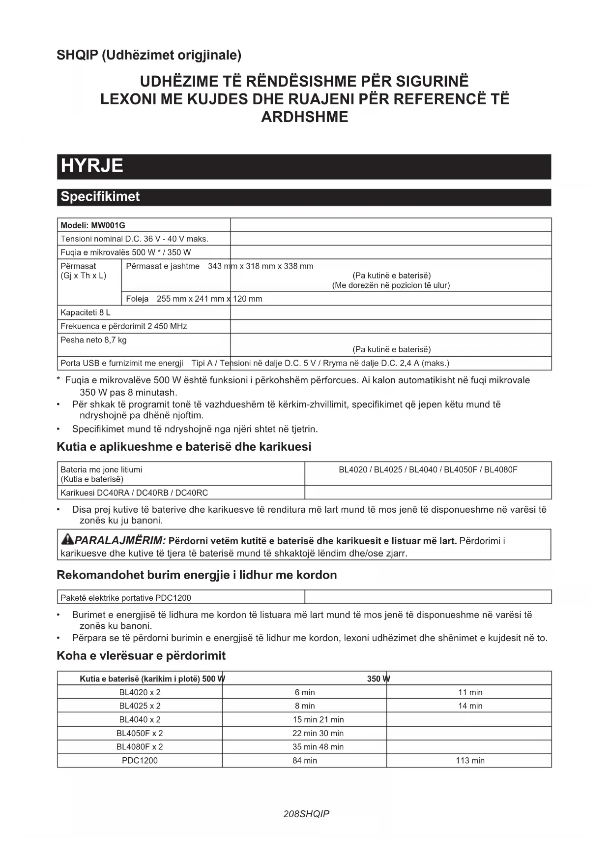 - Ramenski pas OPOMBA: Nekateri predmeti na seznamu so lahko priloženiorodjukotstandardnadodatnaoprema. Lahkoserazlikujejooddržavedodržave.208 SHQIP SHQIP (Udhëzimet origjinale) UDHËZIME TË RËNDËSISHME PËR SIGURINË LEXONI ME KUJDES DHE RUAJENI PËR REFERENCË TË ARDHSHME HYRJE Specikimet Modeli: MW001GTensioni nominal D.C. 36 V - 40 V maks.Fuqia e mikrovalës 500 W * / 350 WPërmasat(GjxThxL)Përmasatejashtme 343 mm x 318 mm x 338 mm(Pa kutinë e baterisë)(Me dorezën në pozicion të ulur)Foleja 255 mm x 241 mm x 120 mmKapaciteti 8 LFrekuenca e përdorimit 2 450 MHzPesha neto 8,7 kg(Pa kutinë e baterisë)PortaUSBefurnizimitmeenergji TipiA/TensioninëdaljeD.C.5V/RrymanëdaljeD.C.2,4A(maks.)* Fuqia e mikrovalëve 500 W është funksioni i përkohshëm përforcues. Ai kalon automatikisht në fuqi mikrovale 350 W pas 8 minutash.• Përshkaktëprogramittonëtëvazhdueshëmtëkërkim-zhvillimit,specikimetqëjepenkëtumundtëndryshojnëpadhënënjoftim.• Specikimetmundtëndryshojnënganjërishtetnëtjetrin. Kutia e aplikueshme e baterisë dhe karikuesi Bateriamejonelitiumi(Kutia e baterisë)BL4020 / BL4025 / BL4040 / BL4050F / BL4080FKarikuesi DC40RA / DC40RB / DC40RC• Disaprejkutivetëbaterivedhekarikuesvetërendituramëlartmundtëmosjenëtëdisponueshmenëvarësitëzonëskujubanoni. PARALAJMËRIM: Përdorni vetëm kutitë e baterisë dhe karikuesit e listuar më lart. Përdorimi i karikuesvedhekutivetëtjeratëbaterisëmundtëshkaktojëlëndimdhe/osezjarr. Rekomandohet burim energjie i lidhur me kordon Paketë elektrike portative PDC1200• Burimeteenergjisëtëlidhuramekordontëlistuaramëlartmundtëmosjenëtëdisponueshmenëvarësitëzonës ku banoni.• Përparasetëpërdorniburimineenergjisëtëlidhurmekordon,lexoniudhëzimetdheshënimetekujdesitnëto. Koha e vlerësuar e përdorimit Kutia e baterisë (karikim i plotë) 500 W 350 WBL4020 x 2 6 min 11 minBL4025 x 2 8 min 14 minBL4040 x 2 15 min 21 minBL4050F x 2 22 min 30 minBL4080F x 2 35 min 48 minPDC1200 84 min 113 min209 SHQIP SHËNIM:Vleratjanëmepërafërsidhemundtëndryshojnënëvarësitëstatusittëkarikimitdhekushtevetë përdorimit. SHËNIM:Kohaevlerësuarepërdorimitmenjëbateriështërrethgjysmaeperiudhëskurpërdorendybateri. Përdorimi i synuar Pajisjasynohetpërngrohjeneushqimit. Masa të rëndësishme PARALAJMËRIM: Shërbimi i kësaj pajisjeje duhet të kryhet vetëm nga personel i kualikuar shërbimi. Kontaktoni me qendrën më të afërt të autorizuar të shërbimit për kontroll, riparim apo rregullim. PARALAJMËRIM: Mos u përpiqni ta vini në punë pajisjen me derën të hapur, duke qenë se përdorimi me derë të hapur mund të shkaktojë ekspozim të dëmshëm ndaj energjisë së mikrovalëve. PARALAJMËRIM: Nëse dëmtohet dera (deformohet), menteshat (thyhen apo lirohen), guarnicionet e derës apo sipërfaqja izoluese, furra me mikrovalë nuk duhet të vihet në punë pa u riparuar nga një person i trajnuar. PARALAJMËRIM: Është e rrezikshme për cilindo veç personit të trajnuar që të kryejë çfarëdo shërbimi apo pune riparuese që përfshin heqjen e ndonjë kapaku që ofron mbrojtje kundër ekspozimit ndaj energjisë së mikrovalëve. PARALAJMËRIM: Përdoreni këtë pajisje vetëm për përdorimin e synuar, siç përshkruhet në manual. PARALAJMËRIM: Mos përdorni kimikate apo avuj gërryes në këtë pajisje. PARALAJMËRIM: Ky lloj pajisjeje është projektuar specikisht për të ngrohur, gatuar apo tharë ushqimin. Nuk është projektuar për përdorim industrial apo laboratorik. PARALAJMËRIM: Lëngjet apo ushqime të tjera nuk duhen ngrohur në enë të mbyllura, duke qenë se mund të shpërthejnë.