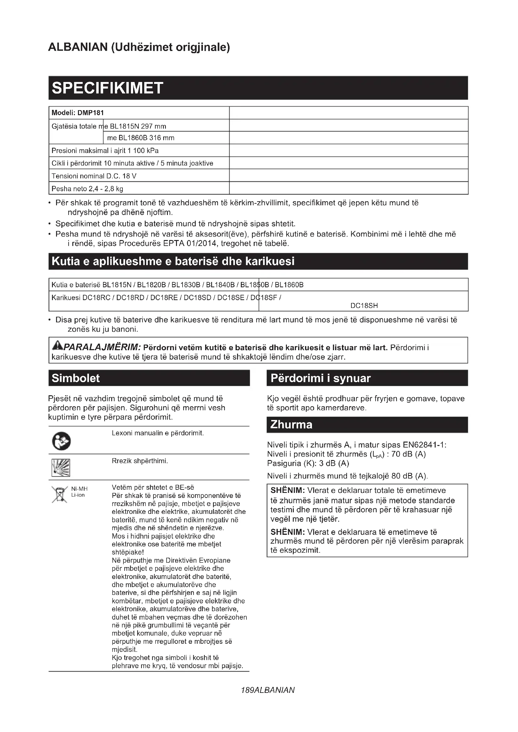 - Bateri dhe ngarkues origjinal Makita SHËNIM: Disa artikuj të listës mund të përfshihen në paketën e veglës si aksesorë standardë. Ato mund të ndryshojnë nga njëri shtet në tjetrin.198 БЪЛГАРСКИ БЪЛГАРСКИ (Превод на оригиналните инструкции) СПЕЦИФИКАЦИИ Модел: DMP181