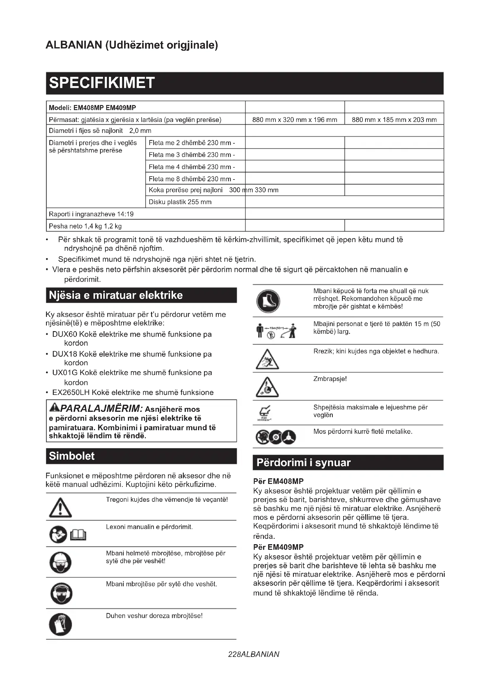 Përparasetëkërkoniriparimebëniinspektimettuaja.Nësezbulonindonjëproblemqënukshpjegohetnëmanual, mosumundonitëçmontonimakinerinë.PorpërriparimedrejtojuniQendravetëAutorizuaratëShërbimitMakita, dukepërdorurgjithmonëpjesëzëvendësueseMakita. Gjendja anormale Shkaku i mundshëm (keqfunksionimi) Zgjidhja Motori nuk ndizet. - Referojunimanualittëpërdorimittënjësisë elektrike. Motorindalonshpejt. - Referojunimanualittëpërdorimittënjësisë elektrike. Shpejtësiaemotoritnukrritet. - Referojunimanualittëpërdorimittënjësisë elektrike.238 ALBANIAN Gjendja anormale Shkaku i mundshëm (keqfunksionimi) Zgjidhja Vegla prerëse nuk rrotullohet. Ndalojenimenjëherëmotorin. Aksesor i lirë i veglës prerëse Shtrëngojenimirë. Veglaprerësekakapurnjëdegë. Hiqniobjektinehuaj Sistemtransmisionijonormal Kontaktonimenjëqendërtëautorizuarshërbimi për riparim. Njësiakryesoredridhetnëmënyrë jonormale. Ndalojenimenjëherëmotorin. Vegël prerëse e thyer, e përthyer ose e konsumuar Zëvendësoni veglën prerëse. Aksesor i lirë i veglës prerëse Shtrëngojenimirë. Njëriskajijessënajlonitështëprishur dhekokaprerëseprejnajloniështë çekuilibruar. Furnizojenijenprerëseprejnajlonidukegoditur kokënprerëseprejnajloninëtokë. Aksesor i parregullt i veglës prerëse Vendoseni mirë. Sistemtransmisionijonormal Kontaktonimenjëqendërtëautorizuarshërbimi për riparim. Fletaprerësenukndalonmenjëherë. Ndalojenimenjëherëmotorin. Njësiaelektrikenukfunksiononmirë. Referojunimanualittëpërdorimittënjësisë elektrike. Fijaprerëseprejnajloninuk furnizohet. Fijakambaruarosekangecurnë bobinë. Kthejenijenprapa. Fijaprerëseprejnajloninukështë prerënëgjatësinëeduhur. Prerësiijesnëmbrojtësështë dëmtuar ose mungon. Kontaktonimenjëqendërtëautorizuarshërbimi për riparim. Fijazgjatetpërtejmbrojtësit. Kthejenijenprapa.239 БЪЛГАРСКИ БЪЛГАРСКИ (Превод на оригиналните инструкции) СПЕЦИФИКАЦИИ Модел: EM408MP EM409MP Размери:дължинахширинахвисочина(безрежещ инструмент) 880ммx320ммx196мм 880ммx185ммx203мм Диаметърнанайлоноватакорда 2,0мм Приложимрежещинструмент идиаметърнарязане Режещдискс2зъба 230мм – Режещдискс3зъба 230мм – Режещдискс4зъба 230мм – Режещдискс8зъба 230мм – Режещаглаваснайлонова