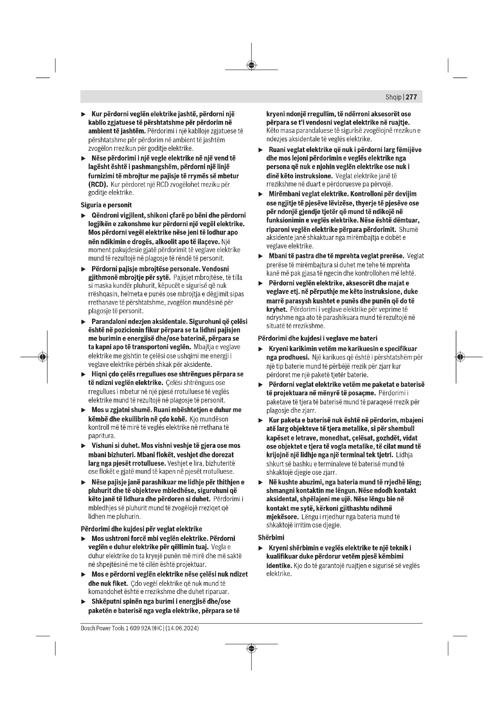 Литиум-јонски: Ве молиме внимавајте на напомените во делот Транспорт (види „Транспорт“, Страница276). Shqip Udhëzime sigurie Paralajmërime të përgjithshme sigurie për veglat elektrike PARALAJMËRIM Lexoni të gjitha paralajmërimet e sigurisë dhe të gjitha instruksionet. Mosndjekja e të gjitha paralajmërimeve dhe instruksioneve mund të rezultojë në goditje elektrike, zjarr dhe/ose plagosje të rëndë. Ruani të gjitha paralajmërimet dhe instruksionet për t'iu referuar në të ardhmen. Termi "vegël elektrike" në paralajmërime i referohet veglës elektrike (me kordon) që punon me energji nga rrjeti elektrik ose veglës elektrike (pa kordon) që punon me energji nga bateria. Siguria e vendit të punës u Mbani vendin e punës të pastër dhe të ndriçuar mirë. Vendet e rrëmujshme ose të errëta përbëjnë shkak për aksidente. u Mos i përdorni veglat elektrike në atmosfera shpërthyese, si për shembull në prani të lëngjeve, gazeve ose pluhurit të ndezshëm. Veglat e punës krijojnë shkëndija që mund të ndezin pluhurin ose avujt. u Mbani larg fëmijët dhe kureshtarët gjatë përdorimit të veglës elektrike. Tërheqja e vëmendjes mund të bëjë që të humbni kontrollin. Siguria elektrike u Spinat e veglave elektrike duhet të përputhen me prizën elektrike. Mos modifikoni kurrë në asnjë mënyrë spinën. Mos përdorni me veglat elektrike spina përshtatëse me tokëzim. Spinat e pamodifikuara dhe përputhja me prizat zvogëlon rrezikun e goditjes elektrike. u Shmangni kontaktin e trupit me sipërfaqet e tokëzuara, si për shembull tubacionet, radiatorët, sobat dhe frigoriferët. Ekziston një rrezik i shtuar i goditjes elektrike nëse trupi juaj është i tokëzuar. u Mos i ekspozoni veglat elektrike në shi ose kushte të lagështa. Uji që hyn në një vegël elektrike do të rritë rrezikun për goditje elektrike. u Mos e keqpërdorni kordonin. Mos e përdorni kurrë kordonin për të mbajtur, për të tërhequr ose për të shkëputur veglën elektrike nga priza. Mbajeni kordonin larg nxehtësisë, vajit, cepave të mprehtë ose pjesëve lëvizëse. Kordonët e dëmtuar ose të ngatërruar rritin rrezikun për goditje elektrike. 1 609 92A 9HC | (14.06.2024) Bosch Power ToolsShqip | 277 u Kur përdorni veglën elektrike jashtë, përdorni një kabllo zgjatuese të përshtatshme për përdorim në ambient të jashtëm. Përdorimi i një kablloje zgjatuese të përshtatshme për përdorim në ambient të jashtëm zvogëlon rrezikun për goditje elektrike. u Nëse përdorimi i një vegle elektrike në një vend të lagësht është i pashmangshëm, përdorni një linjë furnizimi të mbrojtur me pajisje të rrymës së mbetur (RCD). Kur përdoret një RCD zvogëlohet rreziku për goditje elektrike. Siguria e personit u Qëndroni vigjilent, shikoni çfarë po bëni dhe përdorni logjikën e zakonshme kur përdorni një vegël elektrike. Mos përdorni vegël elektrike nëse jeni të lodhur apo nën ndikimin e drogës, alkoolit apo të ilaçeve. Një moment pakujdesie gjatë përdorimit të veglave elektrike mund të rezultojë në plagosje të rëndë të personit. u Përdorni pajisje mbrojtëse personale. Vendosni gjithmonë mbrojtje për sytë. Pajisjet mbrojtëse, të tilla si maska kundër pluhurit, këpucët e sigurisë që nuk rrëshqasin, helmeta e punës ose mbrojtja e dëgjimit sipas rrethanave të përshtatshme, zvogëlon mundësinë për plagosje të personit. u Parandaloni ndezjen aksidentale. Sigurohuni që çelësi është në pozicionin fikur përpara se ta lidhni pajisjen me burimin e energjisë dhe/ose baterinë, përpara se ta kapni apo të transportoni veglën. Mbajtja e veglave elektrike me gishtin te çelësi ose ushqimi me energji i veglave elektrike përbën shkak për aksidente. u Hiqni çdo çelës rregullues ose shtrëngues përpara se të ndizni veglën elektrike. Çelësi shtrëngues ose rregullues i mbetur në një pjesë rrotulluese të veglës elektrike mund të rezultojë në plagosje të personit. u Mos u zgjatni shumë. Ruani mbështetjen e duhur me këmbë dhe ekuilibrin në çdo kohë. Kjo mundëson kontroll më të mirë të veglës elektrike në rrethana të papritura. u Vishuni si duhet. Mos vishni veshje të gjera ose mos mbani bizhuteri. Mbani flokët, veshjet dhe dorezat larg nga pjesët rrotulluese. Veshjet e lira, bizhuteritë ose flokët e gjatë mund të kapen në pjesët rrotulluese. u Nëse pajisje janë parashikuar me lidhje për thithjen e pluhurit dhe të objekteve mbledhëse, sigurohuni që këto janë të lidhura dhe përdoren si duhet. Përdorimi i mbledhjes së pluhurit mund të zvogëlojë rreziqet që lidhen me pluhurin. Përdorimi dhe kujdesi për veglat elektrike u Mos ushtroni forcë mbi veglën elektrike. Përdorni veglën e duhur elektrike për qëllimin tuaj. Vegla e duhur elektrike do ta kryejë punën më mirë dhe më saktë në shpejtësinë me të cilën është projektuar. u Mos e përdorni veglën elektrike nëse çelësi nuk ndizet dhe nuk fiket. Çdo vegël elektrike që nuk mund të komandohet është e rrezikshme dhe duhet riparuar. u Shkëputni spinën nga burimi i energjisë dhe/ose paketën e baterisë nga vegla elektrike, përpara se të kryeni ndonjë rregullim, të ndërroni aksesorët ose përpara se t'i vendosni veglat elektrike në ruajtje. Këto masa parandaluese të sigurisë zvogëlojnë rrezikun e ndezjes aksidentale të veglës elektrike. u Ruani veglat elektrike që nuk i përdorni larg fëmijëve dhe mos lejoni përdorimin e veglës elektrike nga persona që nuk e njohin veglën elektrike ose nuk i dinë këto instruksione. Veglat elektrike janë të rrezikshme në duart e përdoruesve pa përvojë. u Mirëmbani veglat elektrike. Kontrolloni për devijim ose ngjitje të pjesëve lëvizëse, thyerje të pjesëve ose për ndonjë gjendje tjetër që mund të ndikojë në funksioni