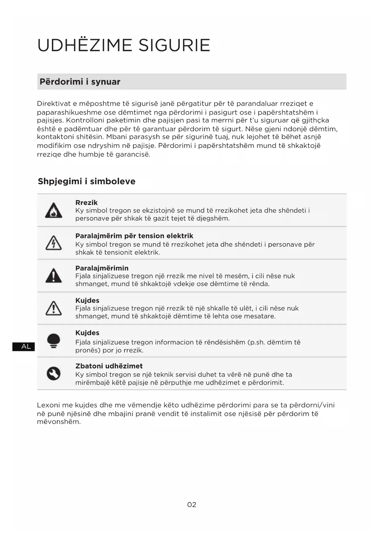 Përdorimi i synuar Rrezik Paralajmërim për tension elektrik Paralajmërimin Kujdes Kujdes Zbatoni udhëzimet Shpjegimi i simboleve Direktivat e mëposhtme të sigurisë janë përgatitur për të parandaluar rreziqet e paparashikueshme ose dëmtimet nga përdorimi i pasigurt ose i papërshtatshëm i pajisjes. Kontrolloni paketimin dhe pajisjen pasi ta merrni për t’u siguruar që gjithçka është e padëmtuar dhe për të garantuar përdorim të sigurt. Nëse gjeni ndonjë dëmtim, kontaktoni shitësin. Mbani parasysh se për sigurinë tuaj, nuk lejohet të bëhet asnjë modifikim ose ndryshim në pajisje. Përdorimi i papërshtatshëm mund të shkaktojë rreziqe dhe humbje të garancisë. Lexoni me kujdes dhe me vëmendje këto udhëzime përdorimi para se ta përdorni/vini në punë njësinë dhe mbajini pranë vendit të instalimit ose njësisë për përdorim të mëvonshëm. Ky simbol tregon se ekzistojnë se mund të rrezikohet jeta dhe shëndeti i personave për shkak të gazit tejet të djegshëm. Ky simbol tregon se mund të rrezikohet jeta dhe shëndeti i personave për shkak të tensionit elektrik. Fjala sinjalizuese tregon një rrezik me nivel të mesëm, i cili nëse nuk shmanget, mund të shkaktojë vdekje ose dëmtime të rënda. Fjala sinjalizuese tregon një rrezik të një shkalle të ulët, i cili nëse nuk shmanget, mund të shkaktojë dëmtime të lehta ose mesatare. Fjala sinjalizuese tregon informacion të rëndësishëm (p.sh. dëmtim të pronës) por jo rrezik. Ky simbol tregon se një teknik servisi duhet ta vërë në punë dhe ta mirëmbajë këtë pajisje në përputhje me udhëzimet e përdorimit.