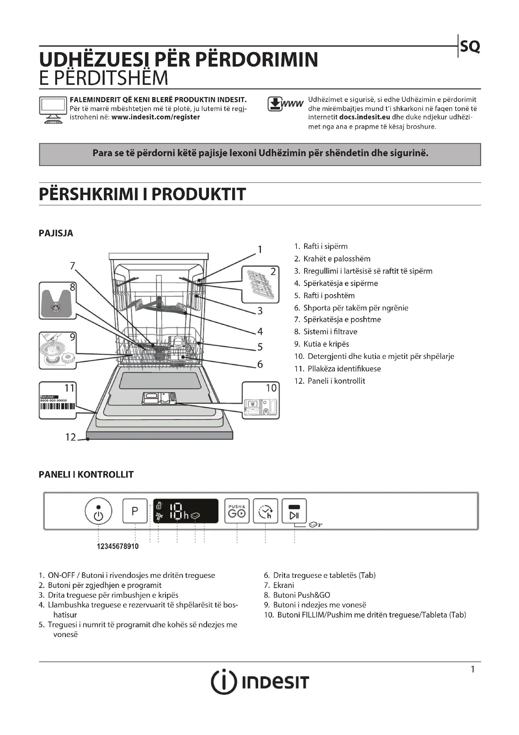 Para se të përdorni këtë pajisje lexoni Udhëzimin për shëndetin dhe sigurinë. PAJISJA FALEMINDERIT QË KENI BLERË PRODUKTIN INDESIT. Për të marrë mbështetjen më të plotë, ju lutemi të regj-istroheni në: www.indesit.com/registerUdhëzimet e sigurisë, si edhe Udhëzimin e përdorimit dhe mirëmbajtjes mund t’i shkarkoni në faqen tonë të internetit docs.indesit.eu dhe duke ndjekur udhëzi- met nga ana e prapme të kësaj broshure.1. Rafti i sipërm2. Krahët e palosshëm3. Rregullimi i lartësisë së raftit të sipërm4. Spërkatësja e sipërme5. Rafti i poshtëm6. Shporta për takëm për ngrënie7. Spërkatësja e poshtme8. Sistemi i ltrave9. Kutia e kripës10. Detergjenti dhe kutia e mjetit për shpëlarje11. Pllakëza identikuese12. Paneli i kontrollit0000 000 00000 Service: