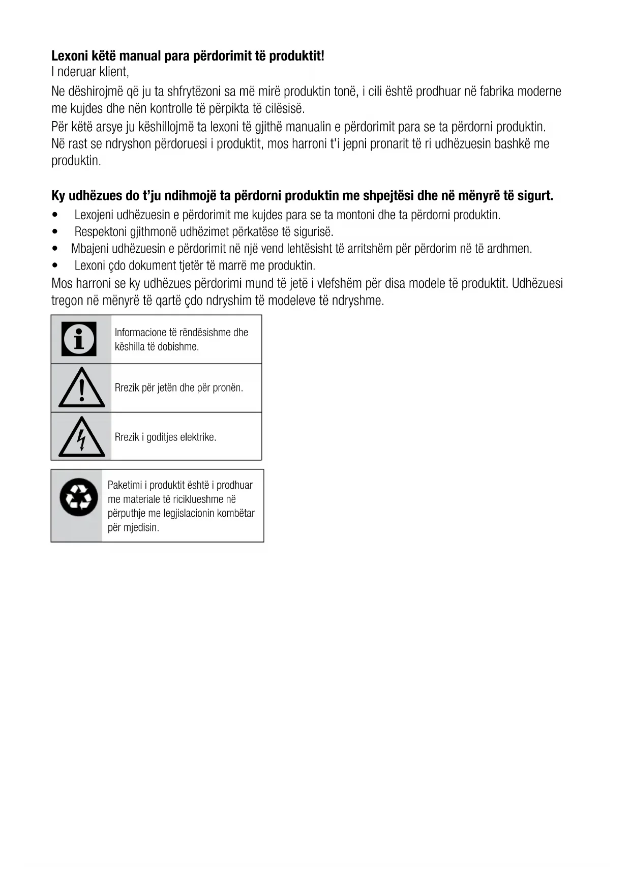 UPOZORENJE: Ako problem i dalje postoji nakon što ste slijedeli upute u ovom poglavlju, obratite se prodavcu ili ovlaštenom servisu. Nemojte pokušavati popraviti proizvod.Lexoni këtë manual para përdorimit të produktit! I nderuar klient, Ne dëshirojmë që ju ta shfrytëzoni sa më mirë produktin tonë, i cili është prodhuar në fabrika moderne me kujdes dhe nën kontrolle të përpikta të cilësisë. Për këtë arsye ju këshillojmë ta lexoni të gjithë manualin e përdorimit para se ta përdorni produktin. Në rast se ndryshon përdoruesi i produktit, mos harroni t'i jepni pronarit të ri udhëzuesin bashkë me produktin. Ky udhëzues do t’ju ndihmojë ta përdorni produktin me shpejtësi dhe në mënyrë të sigurt. t Lexojeni udhëzuesin e përdorimit me kujdes para se ta montoni dhe ta përdorni produktin. t Respektoni gjithmonë udhëzimet përkatëse të sigurisë. t Mbajeni udhëzuesin e përdorimit në një vend lehtësisht të arritshëm për përdorim në të ardhmen. t Lexoni çdo dokument tjetër të marrë me produktin. Mos harroni se ky udhëzues përdorimi mund të jetë i vlefshëm për disa modele të produktit. Udhëzuesi tregon në mënyrë të qartë çdo ndryshim të modeleve të ndryshme.