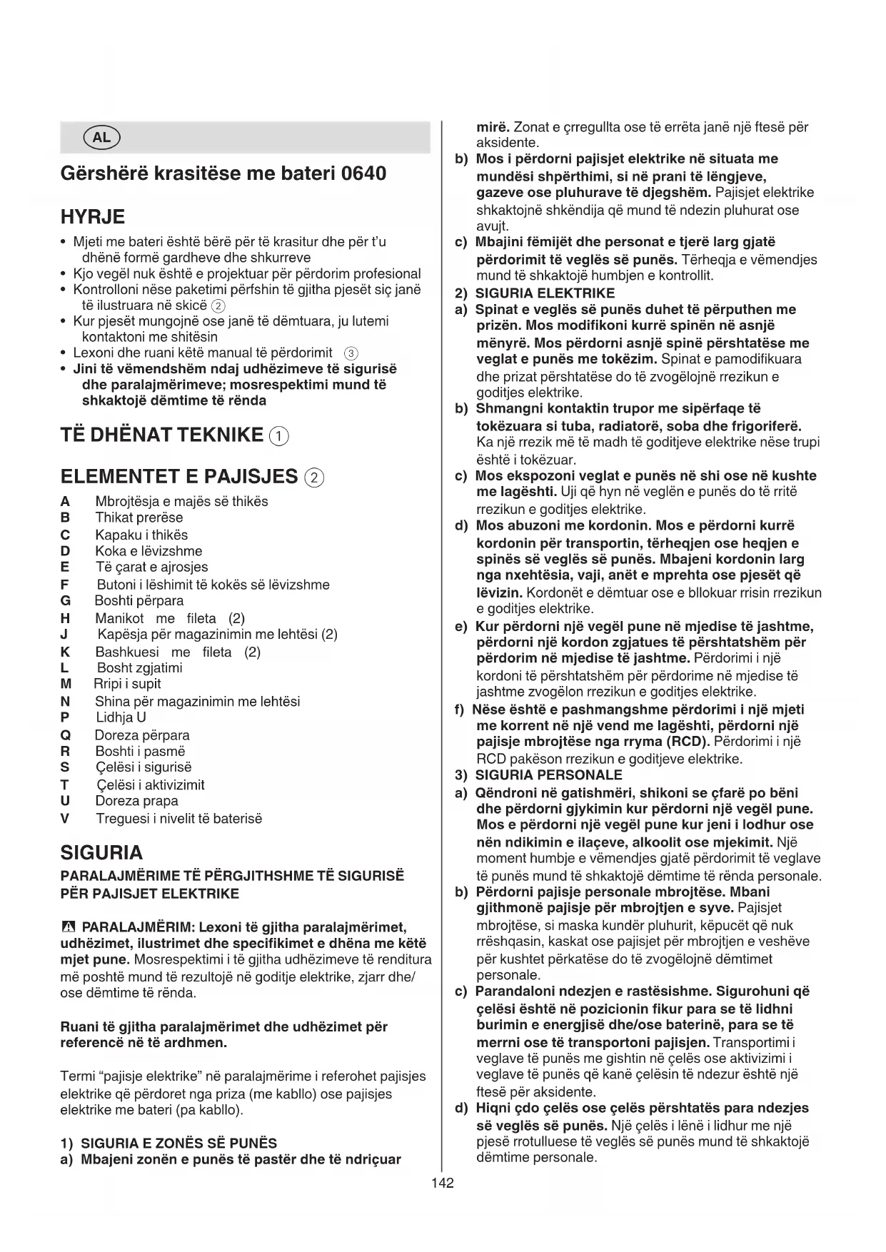 - PARALAJMËRIM: Lexoni të gjitha paralajmërimet, udhëzimet, ilustrimet dhe specikimet e dhëna me këtë mjet pune. Mosrespektimi i të gjitha udhëzimeve të renditura më poshtë mund të rezultojë në goditje elektrike, zjarr dhe/ ose dëmtime të rënda. Ruani të gjitha paralajmërimet dhe udhëzimet për referencë në të ardhmen. Termi “pajisje elektrike” në paralajmërime i referohet pajisjes elektrike që përdoret nga priza (me kabllo) ose pajisjes elektrike me bateri (pa kabllo).