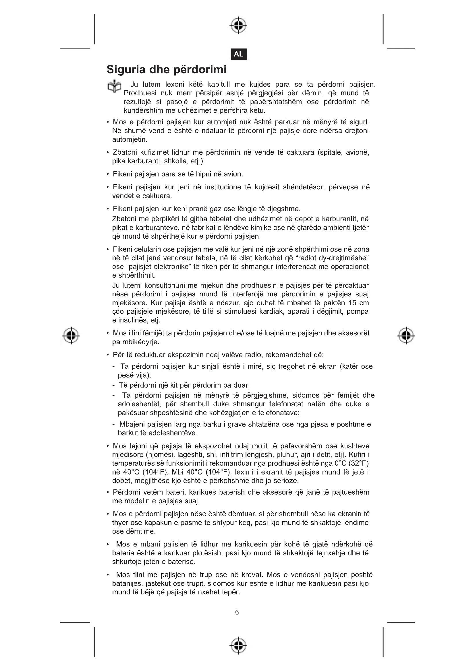 Siguria dhe përdorimi Ju lutem lexoni këtë kapitull me kujdes para se ta përdorni pajisjen. Prodhuesi nuk merr përsipër asnjë përgjegjësi për dëmin, që mund të rezultojë si pasojë e përdorimit të papërshtatshëm ose përdorimit në kundërshtim me udhëzimet e përfshira këtu.