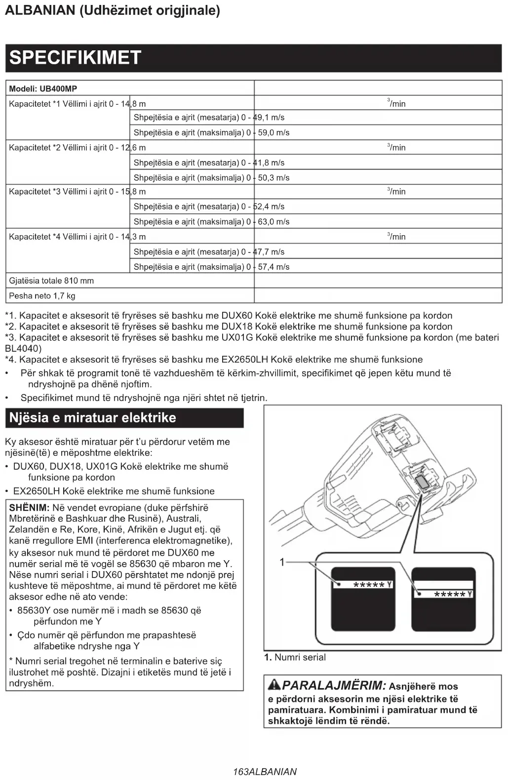 /min Shpejtësia e ajrit (mesatarja) 0 - 47,7 m/sShpejtësia e ajrit (maksimalja) 0 - 57,4 m/sGjatësia totale 810 mmPesha neto 1,7 kg*1. Kapacitet e aksesorit të fryrëses së bashku me DUX60 Kokë elektrike me shumë funksione pa kordon*2. Kapacitet e aksesorit të fryrëses së bashku me DUX18 Kokë elektrike me shumë funksione pa kordon*3. Kapacitet e aksesorit të fryrëses së bashku me UX01G Kokë elektrike me shumë funksione pa kordon (me bateri BL4040)*4. Kapacitet e aksesorit të fryrëses së bashku me EX2650LH Kokë elektrike me shumë funksione• Përshkaktëprogramittonëtëvazhdueshëmtëkërkim-zhvillimit,specikimetqëjepenkëtumundtëndryshojnë pa dhënë njoftim.• Specikimetmundtëndryshojnënganjërishtetnëtjetrin. Njësia e miratuar elektrike Ky aksesor është miratuar për t’u përdorur vetëm me njësinë(të) e mëposhtme elektrike:• DUX60, DUX18, UX01G Kokë elektrike me shumë funksione pa kordon• EX2650LH Kokë elektrike me shumë funksioneSHËNIM: Në vendet evropiane (duke përfshirë Mbretërinë e Bashkuar dhe Rusinë), Australi, Zelandën e Re, Kore, Kinë, Afrikën e Jugut etj. që kanë rregullore EMI (interferenca elektromagnetike), ky aksesor nuk mund të përdoret me DUX60 me numër serial më të vogël se 85630 që mbaron me Y. Nëse numri serial i DUX60 përshtatet me ndonjë prej kushteve të mëposhtme, ai mund të përdoret me këtë aksesor edhe në ato vende:• 85630Y ose numër më i madh se 85630 që përfundon me Y• Çdo numër që përfundon me prapashtesë alfabetike ndryshe nga Y* Numri serial tregohet në terminalin e baterive siç ilustrohet më poshtë. Dizajni i etiketës mund të jetë i ndryshëm.